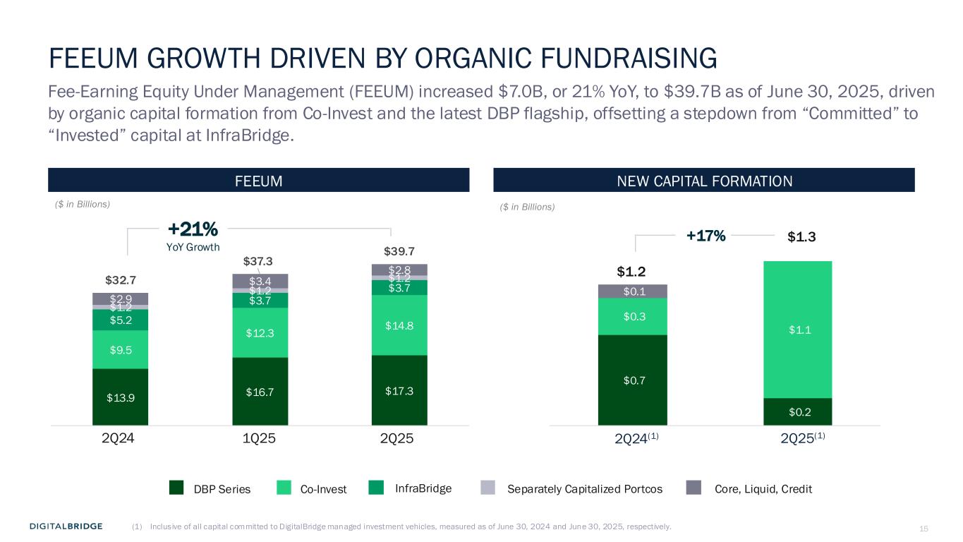 14 SECOND QUARTER 2025 HIGHLIGHTS Financial Highlights Fee Revenue ▪ $85.4 million in 2Q25, up 8% year-over-year. ▪ Driven primarily by new capital formation in our DBP series of funds. Fee Related Earnings ▪ $32.0 million in 2Q25, up 23% year-over-year, consistent with our 2025 guidance, including continued margin expansion. Distributable Earnings ▪ $18.6 million loss in 2Q25, due to a $40 million realized loss from an InfraBridge fund investment. No impact to cash flows in 2Q25. Capital Metrics Fee Earning Equity Under Management (FEEUM) ▪ $39.7 billion, up 21% year-over-year, increased $7.0 billion year-over-year and $2.4 billion over prior quarter. End-of- quarter FEEUM activation will contribute to Fee Revenue growth in subsequent quarters. New Capital Formation ▪ $1.3 billion during 2Q25, driven principally by new data center co-invest capital formation. Corporate Liquidity ▪ $158 million of available corporate cash as of June 30, 2025. Full availability of $100 million revolver. Capital Allocation ▪ Funded $48.2 million of GP commitments and $32.7 million of seed investments for new initiatives in 2Q25. ▪ Common stock dividend of $0.01 per share declared. Capital Activities ▪ Elected to reduce revolver availability from $300 million to $100 million, cost savings and strong liquidity. Unless otherwise denoted as GAAP financial results, reference to Fee Revenue throughout this presentation refers to FRE Fee Revenue.