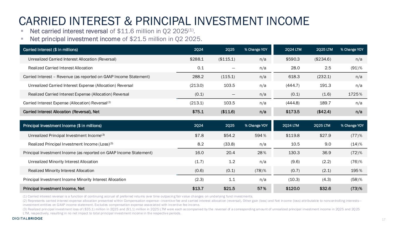 16 ($ in millions) 2Q24 2Q25 % Change YOY 2Q24 LTM 2Q25 LTM % Change YOY Fee Revenue(1) $78.7 $85.4 +8 % $291.9 $353.9 +21 % Cash Compensation(1) (35.6) (36.5) +2 % (138.0) (153.3) +11 % Administrative and Other Expenses(1) (17.1) (16.9) (1) % (63.5) (72.1) +14 % Fee Related Earnings ("FRE")(2) $26.0 $32.0 +23 % $90.4 $128.5 +42 % Realized Carried Interest and Incentive Fees, net(3) 0.2 — n/a 28.2 0.9 (97)% Realized Principal Investment Income (Loss) 7.6 (34.0) n/a 13.9 7.0 (50)% Other Income (Expense)(4) 3.0 2.3 (29)% 12.1 5.5 (54)% Interest Expense and Preferred Dividends (17.2) (18.1) +5 % (74.8) (72.4) (3) % Income Tax Benefit (Expense) — (0.8) n/a 2.6 (2.8) n/a Distributable Earnings ("DE")(2) $19.6 ($18.6) n/a $72.4 $66.7 (8) % FRE Margin 33 % 37 % 31 % 36 % FRE Per Basic Share $0.14 $0.17 $0.51 $0.69 After-tax DE Per Basic Share $0.11 ($0.10) $0.41 $0.36 (1) Amounts determined based upon the definition of FRE and therefore, differ from those presented in GAAP financial results. (2) FRE and DE are presented at the Operating Company level, which is net of amounts attributed to noncontrolling interests. (3) Presented net of expense allocations and includes incentive fees subject to realization events. (4) Other Income (Expense) includes: interest, dividend and other income, and placement fees and other expenses ▪ Fee Revenues in 2Q of $85.4 million. ▪ Fee Related Earnings of $32.0 million, with FRE margin at 37% in Q2 2025 NON-GAAP FINANCIAL RESULTS