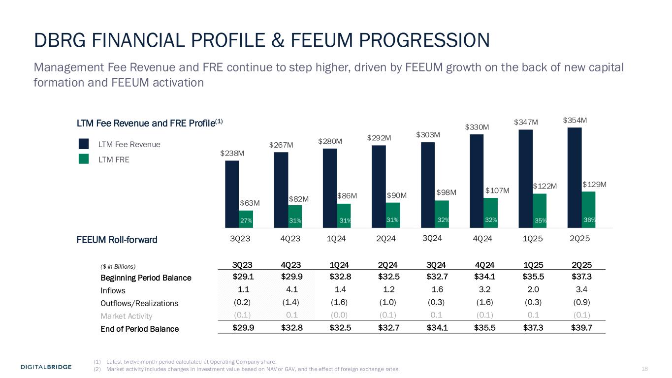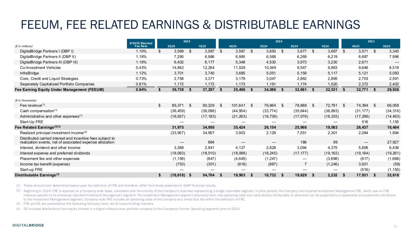 33 6/30/25 Blended Fee Rate 2025 2024 2023 ($ in millions) 2Q25 1Q25 4Q24 3Q24 2Q24 1Q24 4Q23 3Q23 DigitalBridge Partners I (DBP I) 1.10% $ 3,569 $ 3,587 $ 3,587 $ 3,650 $ 3,677 $ 3,687 $ 3,571 $ 3,345 DigitalBridge Partners II (DBP II) 1.18% 7,295 6,986 6,985 6,568 6,269 6,219 6,687 7,996 DigitalBridge Partners III (DBP III) 1.18% 6,402 6,177 5,348 4,530 3,973 3,230 2,671 — Co-Investment Vehicles 0.43% 14,842 12,264 11,539 10,049 9,547 9,863 9,646 8,519 InfraBridge 1.12% 3,701 3,740 3,685 5,051 5,159 5,117 5,121 5,083 Core, Credit and Liquid Strategies 0.73% 2,758 3,371 3,179 3,047 2,862 2,895 2,703 2,591 Separately Capitalized Portfolio Companies 0.81% 1,172 1,172 1,173 1,191 1,174 1,520 2,372 2,402 Fee Earning Equity Under Management (FEEUM) 0.84% $ 39,739 $ 37,297 $ 35,496 $ 34,086 $ 32,661 $ 32,531 $ 32,771 $ 29,936 ($ in thousands) Fee revenue(1) $ 85,371 $ 90,229 $ 101,641 $ 76,664 $ 78,688 $ 72,791 $ 74,394 $ 66,058 Cash compensation(1) (36,459) (38,096) (44,954) (33,774) (35,644) (36,893) (31,177) (34,316) Administrative and other expenses(1) (16,937) (17,183) (21,263) (16,736) (17,076) (16,335) (17,296) (14,493) Start-Up FRE — — — — — — 516 1,155 Fee Related Earnings(2)(3) 31,975 34,950 35,424 26,154 25,968 19,563 26,437 18,404 Realized principal investment income(4) (33,957) 34,907 3,903 2,129 7,551 2,301 2,084 1,994 Distributed carried interest and incentive fees subject to realization events, net of associated expense allocation — 864 — — 186 99 — 27,927 Interest, dividend and other income 3,369 2,941 4,127 2,828 3,094 4,375 5,806 6,436 Interest expense and preferred dividends (18,093) (18,010) (18,088) (18,245) (17,177) (19,162) (19,184) (19,261) Placement fee and other expenses (1,159) (647) (4,645) (1,247) — (3,698) (617) (1,668) Income tax benefit (expense) (753) (301) (818) (887) 7 (1,246) 3,921 (59) Start-up FRE — — — — — — (516) (1,155) Distributable Earnings(3) $ (18,618) $ 54,704 $ 19,903 $ 10,732 $ 19,629 $ 2,232 $ 17,931 $ 32,618 (1) These amounts are determined based upon the definition of FRE and therefore, differ from those presented in GAAP financial results. (2) Beginning in 2024, FRE is reported on a Company-wide basis, consistent with the entirety of the Company’s business representing a single reportable segment. In prior periods, the Company had reported Investment Management FRE, which was an FRE measure specific to its previously reported Investment Management segment. The Investment Management segment previously bore only operating costs that were directly attributable or otherwise can be subjected to a reasonable and systematic attribution to the Investment Management segment. Company-wide FRE includes all operating costs of the Company as a whole that fall within the definition of FRE. (3) FRE and DE are presented at the Operating Company level, net of noncontrolling interests. (4) DE included distributions from equity interest in a digital infrastructure portfolio company (in the Company's former Operating segment) prior to 2024. FEEUM, FEE RELATED EARNINGS & DISTRIBUTABLE EARNINGS