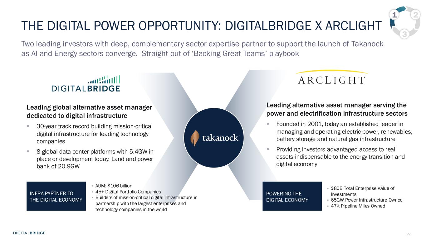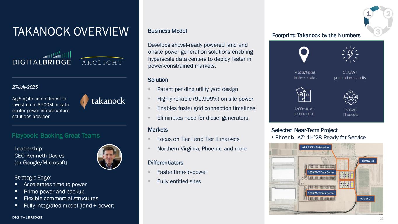 22 Leading alternative asset manager serving the power and electrification infrastructure sectors ▪ Founded in 2001, today an established leader in managing and operating electric power, renewables, battery storage and natural gas infrastructure ▪ Providing investors advantaged access to real assets indispensable to the energy transition and digital economy Leading global alternative asset manager dedicated to digital infrastructure ▪ 30-year track record building mission-critical digital infrastructure for leading technology companies ▪ 8 global data center platforms with 5.4GW in place or development today. Land and power bank of 20.9GW Two leading investors with deep, complementary sector expertise partner to support the launch of Takanock as AI and Energy sectors converge. Straight out of ‘Backing Great Teams’ playbook THE DIGITAL POWER OPPORTUNITY: DIGITALBRIDGE X ARCLIGHT ▪ AUM: $106 billion ▪ 45+ Digital Portfolio Companies ▪ Builders of mission-critical digital infrastructure in partnership with the largest enterprises and technology companies in the world INFRA PARTNER TO THE DIGITAL ECONOMY 1 2 3 ▪ $80B Total Enterprise Value of Investments ▪ 65GW Power Infrastructure Owned ▪ 47K Pipeline Miles Owned POWERING THE DIGITAL ECONOMY