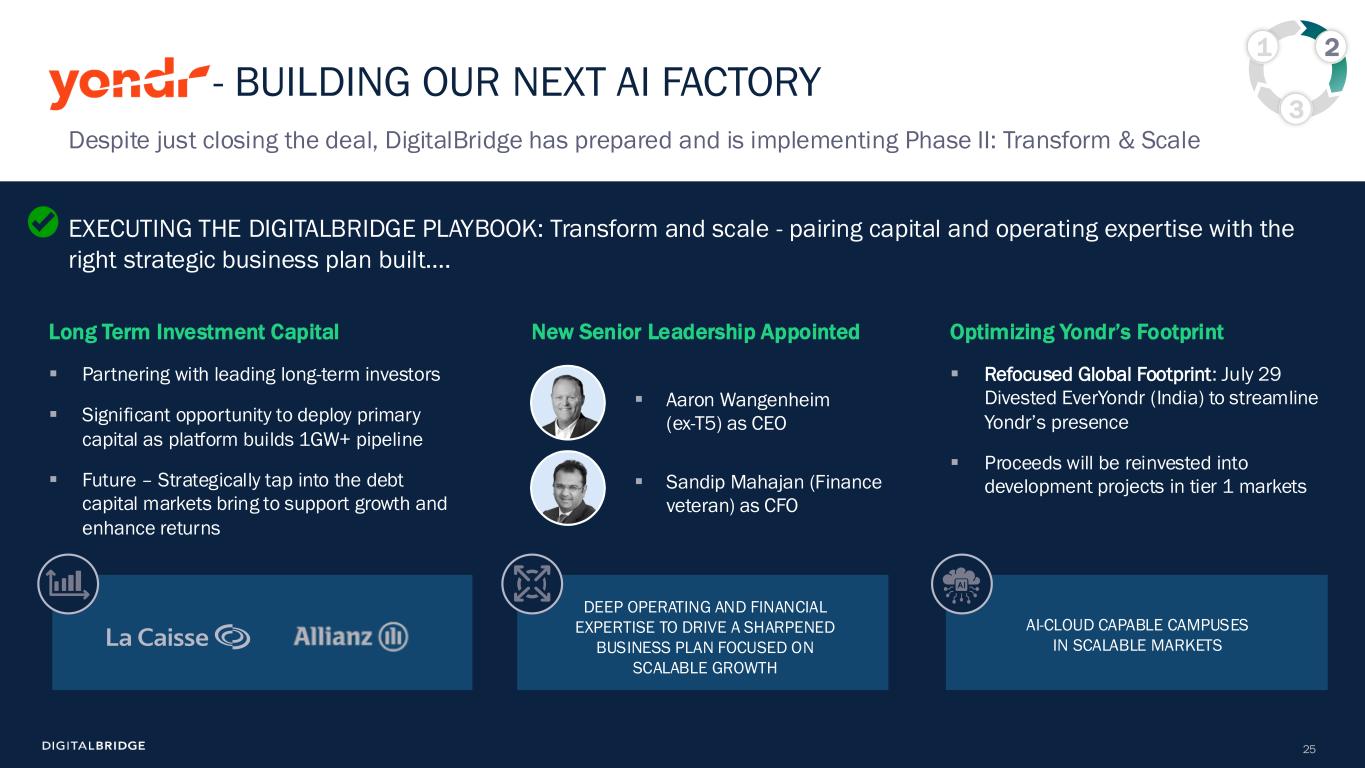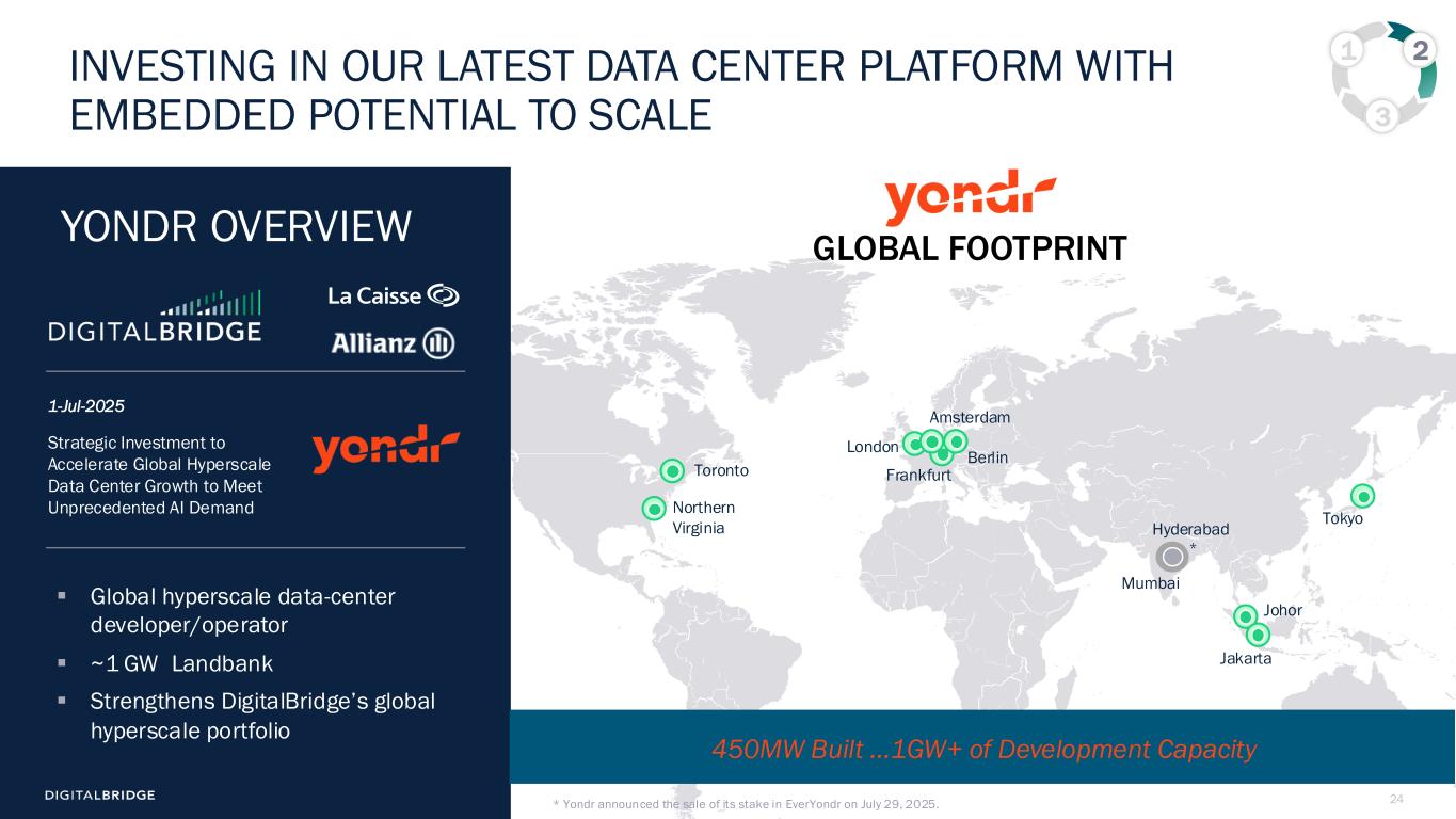24 1 2 3 INVESTING IN OUR LATEST DATA CENTER PLATFORM WITH EMBEDDED POTENTIAL TO SCALE Toronto Northern Virginia London Amsterdam Frankfurt Johor 450MW Built …1GW+ of Development Capacity Strategic Investment to Accelerate Global Hyperscale Data Center Growth to Meet Unprecedented AI Demand 1-Jul-2025 ▪ Global hyperscale data-center developer/operator ▪ ~1 GW Landbank ▪ Strengthens DigitalBridge’s global hyperscale portfolio YONDR OVERVIEW GLOBAL FOOTPRINT Berlin Mumbai Hyderabad Tokyo Jakarta * Yondr announced the sale of its stake in EverYondr on July 29, 2025. *