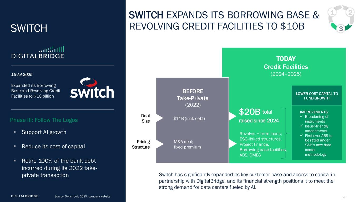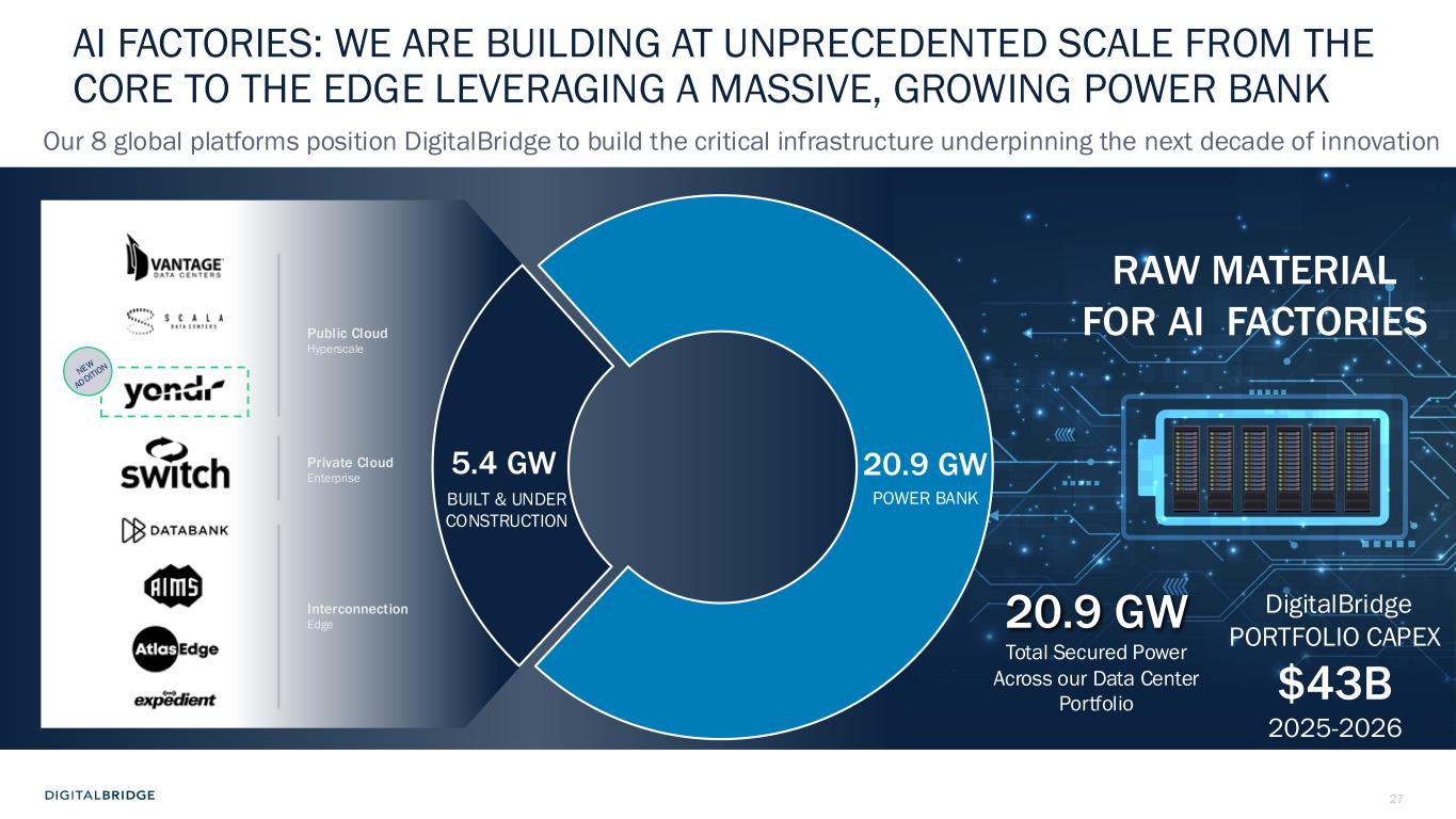 25 - BUILDING OUR NEXT AI FACTORY EXECUTING THE DIGITALBRIDGE PLAYBOOK: Transform and scale - pairing capital and operating expertise with the right strategic business plan built…. Optimizing Yondr’s Footprint ▪ Refocused Global Footprint: July 29 Divested EverYondr (India) to streamline Yondr’s presence ▪ Proceeds will be reinvested into development projects in tier 1 markets 1 2 3 New Senior Leadership Appointed ▪ Aaron Wangenheim (ex-T5) as CEO ▪ Sandip Mahajan (Finance veteran) as CFO AI-CLOUD CAPABLE CAMPUSES IN SCALABLE MARKETS DEEP OPERATING AND FINANCIAL EXPERTISE TO DRIVE A SHARPENED BUSINESS PLAN FOCUSED ON SCALABLE GROWTH Long Term Investment Capital ▪ Partnering with leading long-term investors ▪ Significant opportunity to deploy primary capital as platform builds 1GW+ pipeline ▪ Future – Strategically tap into the debt capital markets bring to support growth and enhance returns Despite just closing the deal, DigitalBridge has prepared and is implementing Phase II: Transform & Scale