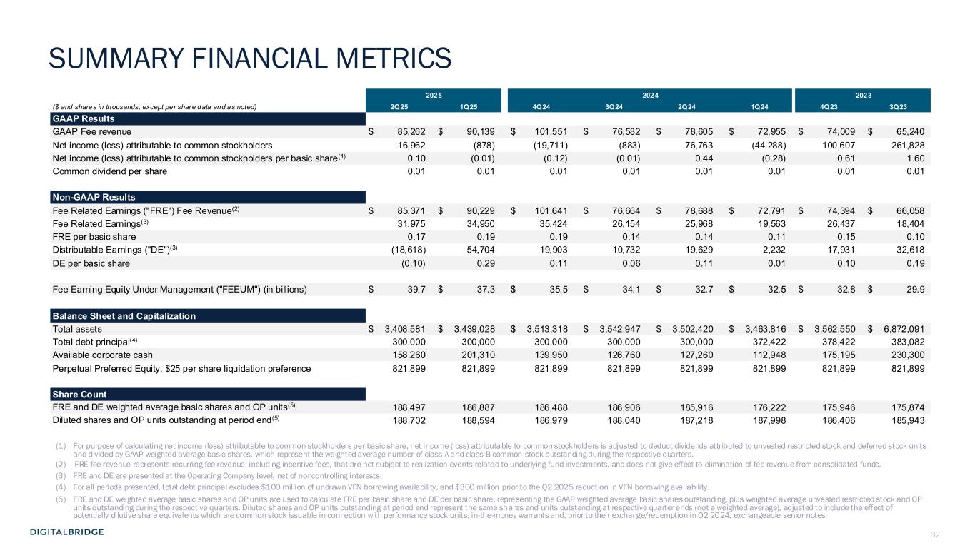 32 2025 2024 2023 ($ and shares in thousands, except per share data and as noted) 2Q25 1Q25 4Q24 3Q24 2Q24 1Q24 4Q23 3Q23 GAAP Results GAAP Fee revenue $ 85,262 $ 90,139 $ 101,551 $ 76,582 $ 78,605 $ 72,955 $ 74,009 $ 65,240 Net income (loss) attributable to common stockholders 16,962 (878) (19,711) (883) 76,763 (44,288) 100,607 261,828 Net income (loss) attributable to common stockholders per basic share(1) 0.10 (0.01) (0.12) (0.01) 0.44 (0.28) 0.61 1.60 Common dividend per share 0.01 0.01 0.01 0.01 0.01 0.01 0.01 0.01 Non-GAAP Results Fee Related Earnings ("FRE") Fee Revenue(2) $ 85,371 $ 90,229 $ 101,641 $ 76,664 $ 78,688 $ 72,791 $ 74,394 $ 66,058 Fee Related Earnings(3) 31,975 34,950 35,424 26,154 25,968 19,563 26,437 18,404 FRE per basic share 0.17 0.19 0.19 0.14 0.14 0.11 0.15 0.10 Distributable Earnings ("DE")(3) (18,618) 54,704 19,903 10,732 19,629 2,232 17,931 32,618 DE per basic share (0.10) 0.29 0.11 0.06 0.11 0.01 0.10 0.19 Fee Earning Equity Under Management ("FEEUM") (in billions) $ 39.7 $ 37.3 $ 35.5 $ 34.1 $ 32.7 $ 32.5 $ 32.8 $ 29.9 Balance Sheet and Capitalization Total assets $ 3,408,581 $ 3,439,028 $ 3,513,318 $ 3,542,947 $ 3,502,420 $ 3,463,816 $ 3,562,550 $ 6,872,091 Total debt principal(4) 300,000 300,000 300,000 300,000 300,000 372,422 378,422 383,082 Available corporate cash 158,260 201,310 139,950 126,760 127,260 112,948 175,195 230,300 Perpetual Preferred Equity, $25 per share liquidation preference 821,899 821,899 821,899 821,899 821,899 821,899 821,899 821,899 Share Count FRE and DE weighted average basic shares and OP units(5) 188,497 186,887 186,488 186,906 185,916 176,222 175,946 175,874 Diluted shares and OP units outstanding at period end(5) 188,702 188,594 186,979 188,040 187,218 187,998 186,406 185,943 (1) For purpose of calculating net income (loss) attributable to common stockholders per basic share, net income (loss) attributable to common stockholders is adjusted to deduct dividends attributed to unvested restricted stock and deferred stock units and divided by GAAP weighted average basic shares, which represent the weighted average number of class A and class B common stock outstanding during the respective quarters. (2) FRE fee revenue represents recurring fee revenue, including incentive fees, that are not subject to realization events related to underlying fund investments, and does not give effect to elimination of fee revenue from consolidated funds. (3) FRE and DE are presented at the Operating Company level, net of noncontrolling interests. (4) For all periods presented, total debt principal excludes $100 million of undrawn VFN borrowing availability, and $300 million prior to the Q2 2025 reduction in VFN borrowing availability. (5) FRE and DE weighted average basic shares and OP units are used to calculate FRE per basic share and DE per basic share, representing the GAAP weighted average basic shares outstanding, plus weighted average unvested restricted stock and OP units outstanding during the respective quarters. Diluted shares and OP units outstanding at period end represent the same shares and units outstanding at respective quarter ends (not a weighted average), adjusted to include the effect of potentially dilutive share equivalents which are common stock issuable in connection with performance stock units, in-the-money warrants and, prior to their exchange/redemption in Q2 2024, exchangeable senior notes. SUMMARY FINANCIAL METRICS