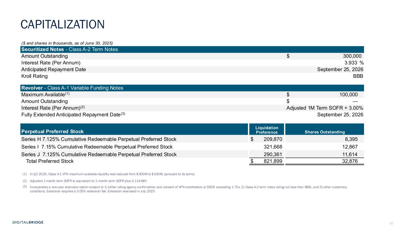 35 ($ and shares in thousands, as of June 30, 2025) Securitized Notes - Class A-2 Term Notes Amount Outstanding $ 300,000 Interest Rate (Per Annum) 3.933 % Anticipated Repayment Date September 25, 2026 Kroll Rating BBB Revolver - Class A-1 Variable Funding Notes Maximum Available(1) $ 100,000 Amount Outstanding $ — Interest Rate (Per Annum)(2) Adjusted 1M Term SOFR + 3.00% Fully Extended Anticipated Repayment Date(3) September 25, 2026 Liquidation Preference Shares OutstandingPerpetual Preferred Stock Series H 7.125% Cumulative Redeemable Perpetual Preferred Stock $ 209,870 8,395 Series I 7.15% Cumulative Redeemable Perpetual Preferred Stock 321,668 12,867 Series J 7.125% Cumulative Redeemable Perpetual Preferred Stock 290,361 11,614 Total Preferred Stock $ 821,899 32,876 (1) In Q2 2025, Class A-1 VFN maximum available liquidity was reduced from $300M to $100M, pursuant to its terms. (2) Adjusted 1-month term SOFR is equivalent to 1-month term SOFR plus 0.11448% (3) Incorporates a one-year extension option subject to 1) either rating agency confirmation and consent of VFN noteholders or DSCR exceeding 1.75x, 2) Class A-2 term notes rating not less than BBB-, and 3) other customary conditions. Extension requires a 0.05% extension fee. Extension exercised in July 2025 CAPITALIZATION