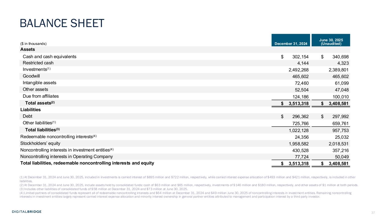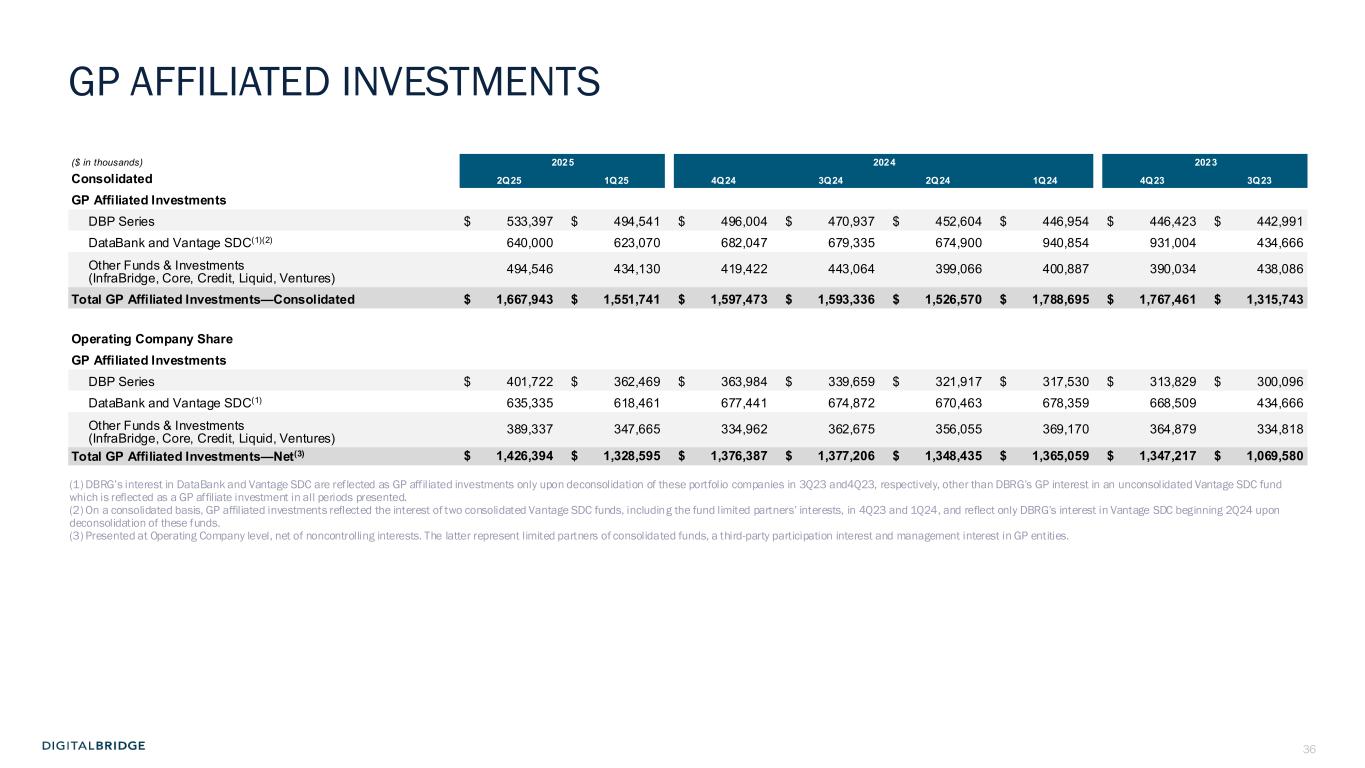 36 ($ in thousands) 2025 2024 2023 Consolidated 2Q25 1Q25 4Q24 3Q24 2Q24 1Q24 4Q23 3Q23 GP Affiliated Investments DBP Series $ 533,397 $ 494,541 $ 496,004 $ 470,937 $ 452,604 $ 446,954 $ 446,423 $ 442,991 DataBank and Vantage SDC(1)(2) 640,000 623,070 682,047 679,335 674,900 940,854 931,004 434,666 Other Funds & Investments (InfraBridge, Core, Credit, Liquid, Ventures) 494,546 434,130 419,422 443,064 399,066 400,887 390,034 438,086 Total GP Affiliated Investments—Consolidated $ 1,667,943 $ 1,551,741 $ 1,597,473 $ 1,593,336 $ 1,526,570 $ 1,788,695 $ 1,767,461 $ 1,315,743 Operating Company Share GP Affiliated Investments DBP Series $ 401,722 $ 362,469 $ 363,984 $ 339,659 $ 321,917 $ 317,530 $ 313,829 $ 300,096 DataBank and Vantage SDC(1) 635,335 618,461 677,441 674,872 670,463 678,359 668,509 434,666 Other Funds & Investments (InfraBridge, Core, Credit, Liquid, Ventures) 389,337 347,665 334,962 362,675 356,055 369,170 364,879 334,818 Total GP Affiliated Investments—Net(3) $ 1,426,394 $ 1,328,595 $ 1,376,387 $ 1,377,206 $ 1,348,435 $ 1,365,059 $ 1,347,217 $ 1,069,580 (1) DBRG’s interest in DataBank and Vantage SDC are reflected as GP affiliated investments only upon deconsolidation of these portfolio companies in 3Q23 and4Q23, respectively, other than DBRG’s GP interest in an unconsolidated Vantage SDC fund which is reflected as a GP affiliate investment in all periods presented. (2) On a consolidated basis, GP affiliated investments reflected the interest of two consolidated Vantage SDC funds, including the fund limited partners’ interests, in 4Q23 and 1Q24, and reflect only DBRG’s interest in Vantage SDC beginning 2Q24 upon deconsolidation of these funds. (3) Presented at Operating Company level, net of noncontrolling interests. The latter represent limited partners of consolidated funds, a third-party participation interest and management interest in GP entities. GP AFFILIATED INVESTMENTS