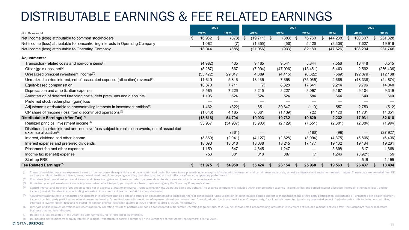 38 2025 2024 2023 ($ in thousands) 2Q25 1Q25 4Q24 3Q24 2Q24 1Q24 4Q23 3Q23 Net income (loss) attributable to common stockholders $ 16,962 $ (878) $ (19,711) $ (883) $ 76,763 $ (44,288) $ 100,607 $ 261,828 Net income (loss) attributable to noncontrolling interests in Operating Company 1,082 (7) (1,355) (50) 5,426 (3,338) 7,627 19,918 Net income (loss) attributable to Operating Company 18,044 (885) (21,066) (933) 82,189 (47,626) 108,234 281,746 Adjustments: Transaction-related costs and non-core items(1) (4,982) 435 9,465 9,541 5,344 7,556 13,448 6,515 Other (gain) loss, net(2) (8,287) 667 (7,094) (47,906) (13,451) 6,463 2,592 (256,439) Unrealized principal investment income(3) (55,422) 29,847 4,389 (4,415) (6,322) (569) (92,079) (12,188) Unrealized carried interest, net of associated expense (allocation) reversal (4) 11,649 5,816 18,165 7,658 (75,065) 2,686 (48,338) (24,874) Equity-based compensation 10,873 7,711 (7) 8,828 17,641 9,214 9,796 14,340 Depreciation and amortization expense 8,585 7,226 8,215 8,227 8,097 9,167 9,104 9,319 Amortization of deferred financing costs, debt premiums and discounts 1,106 524 524 524 584 664 640 660 Preferred stock redemption (gain) loss — — — — — — — — Adjustments attributable to noncontrolling interests in investment entities(5) 1,462 (822) 651 30,647 (110) 557 2,753 (512) OP share of (income) loss from discontinued operations(6) (1,646) 4,185 6,661 (1,439) 722 14,120 11,781 14,051 Distributable Earnings (After Tax)(7) (18,618) 54,704 19,903 10,732 19,629 2,232 17,931 32,618 Realized principal investment income(8) 33,957 (34,907) (3,903) (2,129) (7,551) (2,301) (2,084) (1,994) Distributed carried interest and incentive fees subject to realization events, net of associated expense allocation(3) — (864) — — (186) (99) — (27,927) Interest, dividend and other income (3,369) (2,941) (4,127) (2,828) (3,094) (4,375) (5,806) (6,436) Interest expense and preferred dividends 18,093 18,010 18,088 18,245 17,177 19,162 19,184 19,261 Placement fee and other expenses 1,159 647 4,645 1,247 — 3,698 617 1,668 Income tax (benefit) expense 753 301 818 887 (7) 1,246 (3,921) 59 Start-up FRE — — — — — — 516 1,155 Fee Related Earnings(7) $ 31,975 $ 34,950 $ 35,424 $ 26,154 $ 25,968 $ 19,563 $ 26,437 $ 18,404 (1) Transaction-related costs are expenses incurred in connection with acquisitions and unconsummated deals. Non-core i tems primari ly include acquisition-related compensation and certain severance costs, as well as litigation and settlement-related matters. These costs are excluded from DE as they are related to discrete i tems, are not considered part of our ongoing operating cost structure, and are not reflectiv e of our core operating performance. (2) Comprises (i) all unrealized gains and losses; and (ii) realized gains and losses recorded by consol idated funds or associate d with non-core investments. (3) Unrealized principal investment income is presented net of a thi rd party participation interest, representing only the Operating Company's share. (4) Carried interest and incentive fees are presented net of expense al location or reversal , representing only the Operating Company's share. The expense component is included within compensation expense—incentive fees and carried interest allocation (reversal), other gain (loss), and net income (loss) attributable to noncontroll ing interests in investment enti ties on the GAAP income statement. (5) Adjustments attributable to noncontrolling interests in investment entities pertain to other gain (loss) attributed to limite d partners of consolidated funds. Allocation of: (i) unrealized carried interest to management and a third party participation interest; and (ii ) unreal ized principal investment income to a thi rd party participation interest, are netted against "unrealized carried interest, net of expense (allocation) reversal" and "unrealized principal investment income", respectively, for all periods presented (previously presented gross in "adjustments attributable to noncontrolling interests in investment entities" and recasted for periods prior to the second quarter of 2024 and first quarter of 2025, respectively). (6) OP share of discontinued operations represents primarily operating resul ts of portfol io companies consolidated in the former Operating segment prior to 2024, net of associated noncontroll ing interests in investment enti ties, and residual activities from the Company's former real estate business that had been disposed. (7) DE and FRE are presented at the Operating Company level, net of noncontroll ing interests. (8) DE included distributions from equity interest in a digital infrastructure portfolio company (in the Company's former Operating segment) prior to 2024. DISTRIBUTABLE EARNINGS & FEE RELATED EARNINGS