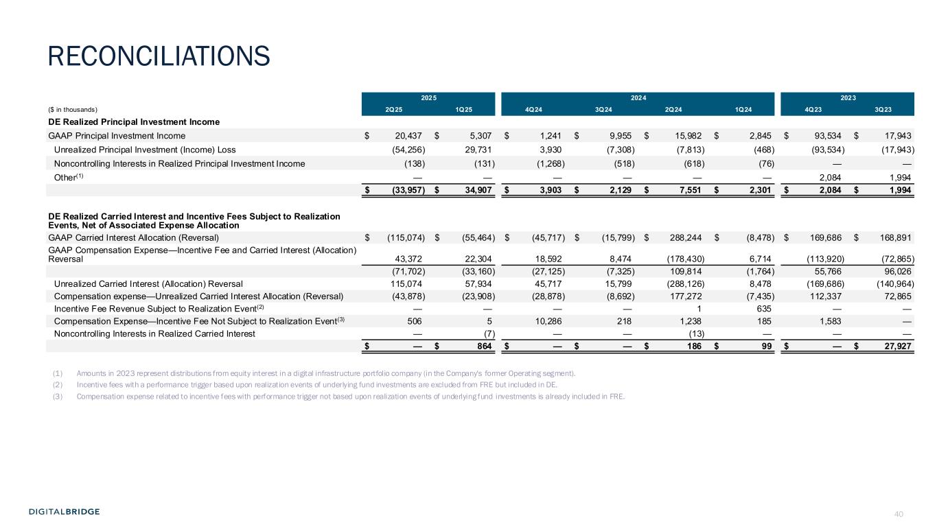 40 2025 2024 2023 ($ in thousands) 2Q25 1Q25 4Q24 3Q24 2Q24 1Q24 4Q23 3Q23 DE Realized Principal Investment Income GAAP Principal Investment Income $ 20,437 $ 5,307 $ 1,241 $ 9,955 $ 15,982 $ 2,845 $ 93,534 $ 17,943 Unrealized Principal Investment (Income) Loss (54,256) 29,731 3,930 (7,308) (7,813) (468) (93,534) (17,943) Noncontrolling Interests in Realized Principal Investment Income (138) (131) (1,268) (518) (618) (76) — — Other(1) — — — — — — 2,084 1,994 $ (33,957) $ 34,907 $ 3,903 $ 2,129 $ 7,551 $ 2,301 $ 2,084 $ 1,994 DE Realized Carried Interest and Incentive Fees Subject to Realization Events, Net of Associated Expense Allocation GAAP Carried Interest Allocation (Reversal) $ (115,074) $ (55,464) $ (45,717) $ (15,799) $ 288,244 $ (8,478) $ 169,686 $ 168,891 GAAP Compensation Expense—Incentive Fee and Carried Interest (Allocation) Reversal 43,372 22,304 18,592 8,474 (178,430) 6,714 (113,920) (72,865) (71,702) (33,160) (27,125) (7,325) 109,814 (1,764) 55,766 96,026 Unrealized Carried Interest (Allocation) Reversal 115,074 57,934 45,717 15,799 (288,126) 8,478 (169,686) (140,964) Compensation expense—Unrealized Carried Interest Allocation (Reversal) (43,878) (23,908) (28,878) (8,692) 177,272 (7,435) 112,337 72,865 Incentive Fee Revenue Subject to Realization Event(2) — — — — 1 635 — — Compensation Expense—Incentive Fee Not Subject to Realization Event(3) 506 5 10,286 218 1,238 185 1,583 — Noncontrolling Interests in Realized Carried Interest — (7) — — (13) — — — $ — $ 864 $ — $ — $ 186 $ 99 $ — $ 27,927 (1) Amounts in 2023 represent distributions from equity interest in a digital infrastructure portfolio company (in the Company's former Operating segment). (2) Incentive fees with a performance trigger based upon realization events of underlying fund investments are excluded from FRE but included in DE. (3) Compensation expense related to incentive fees with performance trigger not based upon realization events of underlying fund investments is already included in FRE. RECONCILIATIONS
