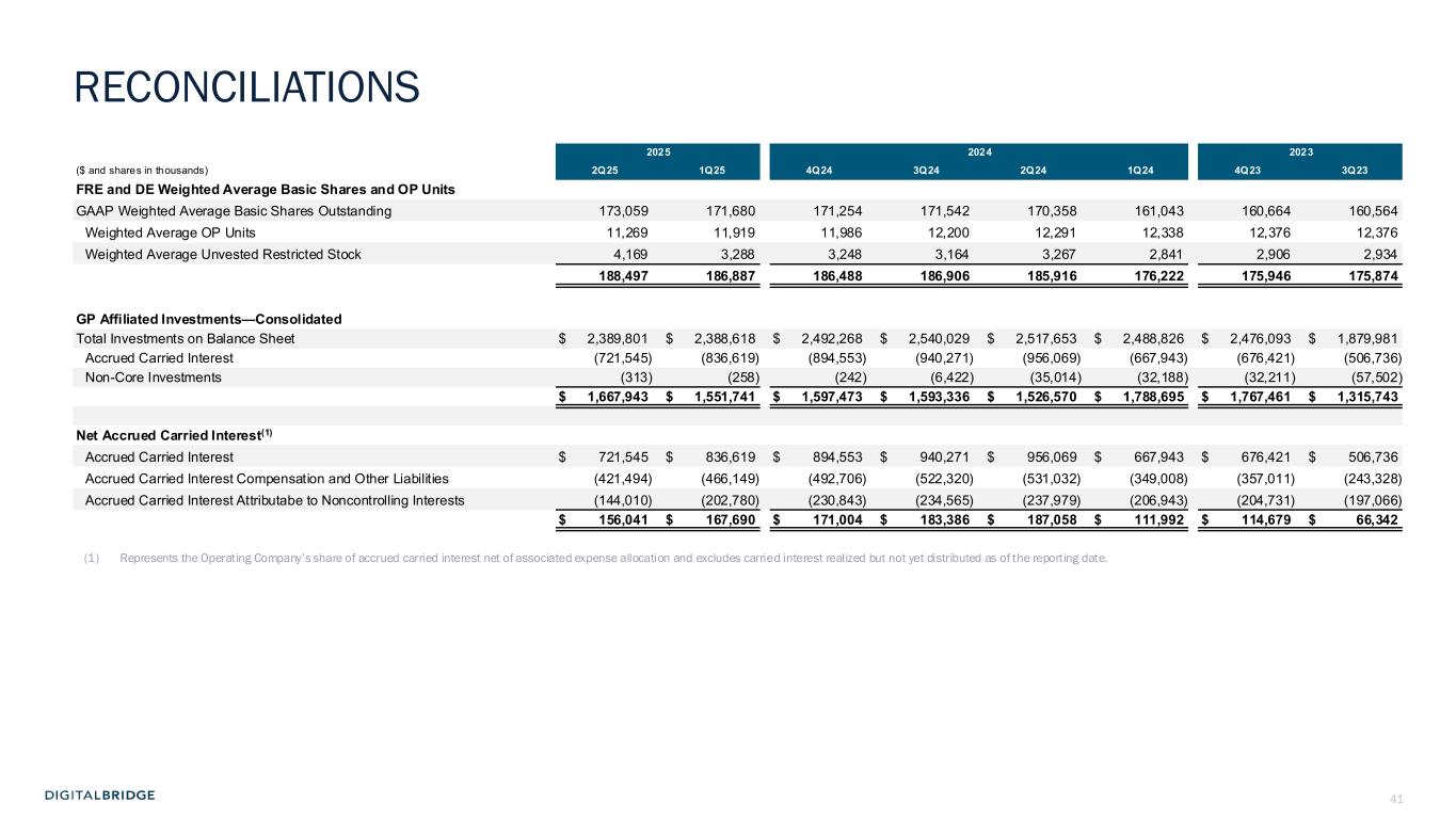 41 2025 2024 2023 ($ and shares in thousands) 2Q25 1Q25 4Q24 3Q24 2Q24 1Q24 4Q23 3Q23 FRE and DE Weighted Average Basic Shares and OP Units GAAP Weighted Average Basic Shares Outstanding 173,059 171,680 171,254 171,542 170,358 161,043 160,664 160,564 Weighted Average OP Units 11,269 11,919 11,986 12,200 12,291 12,338 12,376 12,376 Weighted Average Unvested Restricted Stock 4,169 3,288 3,248 3,164 3,267 2,841 2,906 2,934 188,497 186,887 186,488 186,906 185,916 176,222 175,946 175,874 GP Affiliated Investments—Consolidated Total Investments on Balance Sheet $ 2,389,801 $ 2,388,618 $ 2,492,268 $ 2,540,029 $ 2,517,653 $ 2,488,826 $ 2,476,093 $ 1,879,981 Accrued Carried Interest (721,545) (836,619) (894,553) (940,271) (956,069) (667,943) (676,421) (506,736) Non-Core Investments (313) (258) (242) (6,422) (35,014) (32,188) (32,211) (57,502) $ 1,667,943 $ 1,551,741 $ 1,597,473 $ 1,593,336 $ 1,526,570 $ 1,788,695 $ 1,767,461 $ 1,315,743 Net Accrued Carried Interest(1) Accrued Carried Interest $ 721,545 $ 836,619 $ 894,553 $ 940,271 $ 956,069 $ 667,943 $ 676,421 $ 506,736 Accrued Carried Interest Compensation and Other Liabilities (421,494) (466,149) (492,706) (522,320) (531,032) (349,008) (357,011) (243,328) Accrued Carried Interest Attributabe to Noncontrolling Interests (144,010) (202,780) (230,843) (234,565) (237,979) (206,943) (204,731) (197,066) $ 156,041 $ 167,690 $ 171,004 $ 183,386 $ 187,058 $ 111,992 $ 114,679 $ 66,342 (1) Represents the Operating Company’s share of accrued carried interest net of associated expense allocation and excludes carried interest realized but not yet distributed as of the reporting date. RECONCILIATIONS