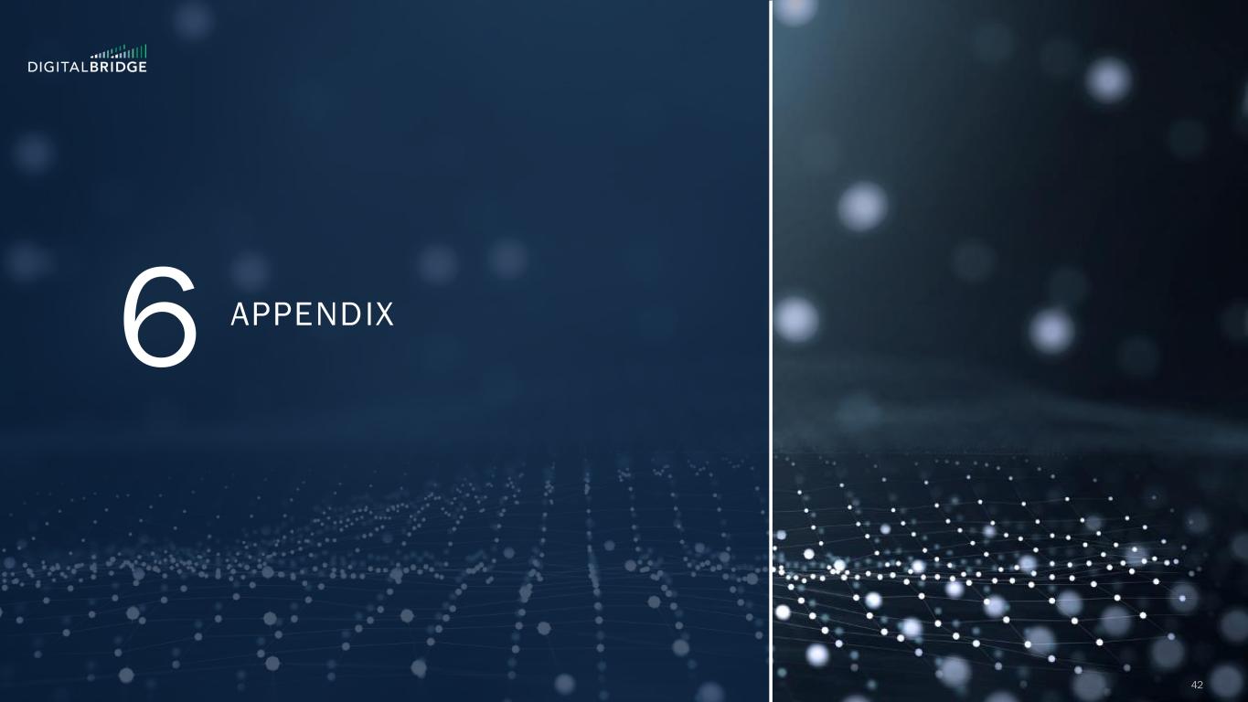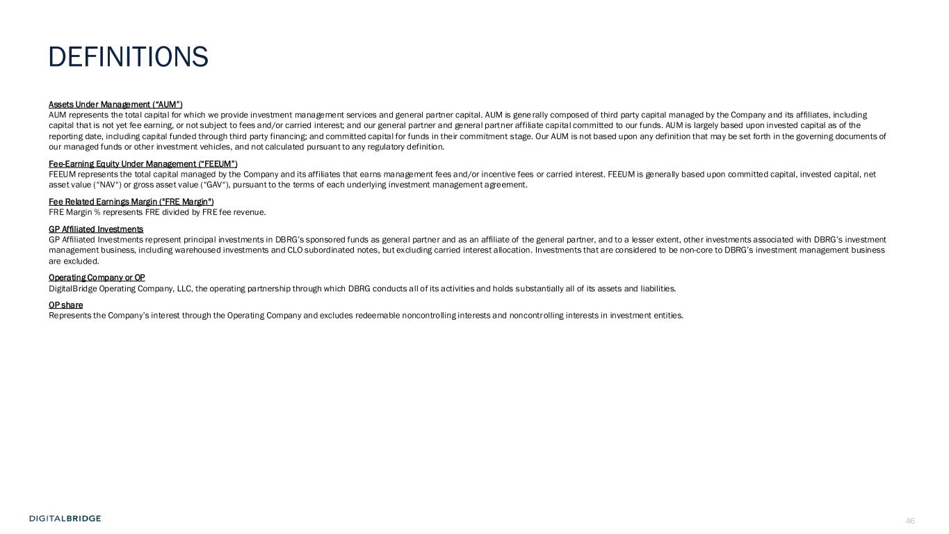 46 Assets Under Management (“AUM”) AUM represents the total capital for which we provide investment management services and general partner capital. AUM is gene rally composed of third party capital managed by the Company and its affiliates, including capital that is not yet fee earning, or not subject to fees and/or carried interest; and our general partner and general partner affiliate capital committed to our funds. AUM is largely based upon invested capital as of the reporting date, including capital funded through third party financing; and committed capital for funds in their commitment stage. Our AUM is not based upon any definition that may be set forth in the governing documents of our managed funds or other investment vehicles, and not calculated pursuant to any regulatory definition. Fee-Earning Equity Under Management (“FEEUM”) FEEUM represents the total capital managed by the Company and its affiliates that earns management fees and/or incentive fees or carried interest. FEEUM is generally based upon committed capital, invested capital, net asset value (“NAV“) or gross asset value (“GAV“), pursuant to the terms of each underlying investment management agreement. Fee Related Earnings Margin ("FRE Margin") FRE Margin % represents FRE divided by FRE fee revenue. GP Affiliated Investments GP Affiliated Investments represent principal investments in DBRG’s sponsored funds as general partner and as an affiliate of the general partner, and to a lesser extent, other investments associated with DBRG’s investment management business, including warehoused investments and CLO subordinated notes, but excluding carried interest allocation. Investments that are considered to be non-core to DBRG’s investment management business are excluded. Operating Company or OP DigitalBridge Operating Company, LLC, the operating partnership through which DBRG conducts all of its activities and holds substantially all of its assets and liabilities. OP share Represents the Company’s interest through the Operating Company and excludes redeemable noncontrolling interests and noncontrolling interests in investment entities. DEFINITIONS