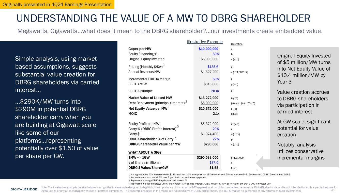 43 BaseCase Operation Capex per MW $10,000,000 a Equity Financing % 50% b Original Equity Invested $5,000,000 c (a*b) Pricing (Monthly $/Kw) $135.6 d Annual Revenue/MW $1,627,200 e (d*1,000*12) Incremental EBITDA Margin 50% f EBITDA/MW $813,600 g (e*f) EBITDA Multiple 20.0x h Market Value of Leased MW $16,272,000 i (g*h) Debt Repayment (principal+interest) $5,900,000 j ((a-c) + (a-c)*6%*3) Net Equity Value per MW $10,372,000 k (j-i) MOIC 2.1x l (k/c) Equity Profit per MW $5,372,000 m (k-c) Carry % (DBRG Profits Interest) 20% n Carry $ $1,074,400 o (m*n) DBRG Shareholder % of Carry 27% p DBRG Shareholder Value per MW $290,088 q (o*p) WHAT ABOUT A GIG? 1MW --> 1GW $290,088,000 r (q X 1,000) # of Shares (millions) 187.0 s DBRG $ Value/Share/GW $1.55 t (s/r) UNDERSTANDING THE VALUE OF A MW TO DBRG SHAREHOLDER Megawatts, Gigawatts…what does it mean to the DBRG shareholder?…our investments create embedded value. Simple analysis, using market- based assumptions, suggests substantial value creation for DBRG shareholders via carried interest… …$290K/MW turns into $290M in potential DBRG shareholder carry when you are building at Gigawatt scale like some of our platforms…representing potentially over $1.50 of value per share per GW. 1 Pricing assumes 50% Hyperscale @~$115/kw/mth, 25% enterprise @~180/kw/mth and 25% wholesale @~$130/kw/mth ; CBRE, GreenStreet, DBRG 2 Simple interest accrues @ 6% over 3 year build out and lease up period 3 Represents average DBRG flagship carried interest % 4 Represents blended average DBRG shareholder % of carried interest,~25% historical, 40% go -forward, per DBRG 2024 Investor Day 1 2 4 3 Illustrative Example Original Equity Invested of $5 million/MW turns into Net Equity Value of $10.4 million/MW by Year 3 Value creation accrues to DBRG shareholders via participation in carried interest At GW scale, significant potential for value creation Notably, analysis utilizes conservative incremental margins Note: The illustrative example detailed above is a hypothetical example designed to highlight the importance of incremental MW expansion at portfolio companies managed by DigitalBridge funds and is not intended to imply expected returns for DigitalBridge or any of its managed vehicles or portfolio companies. The assumptions used in the model are not indicative ofDBRG expectations, and DBRG makes no guarantee of any returns on such investments. Originally presented in 4Q24 Earnings Presentation