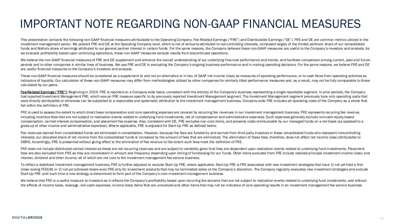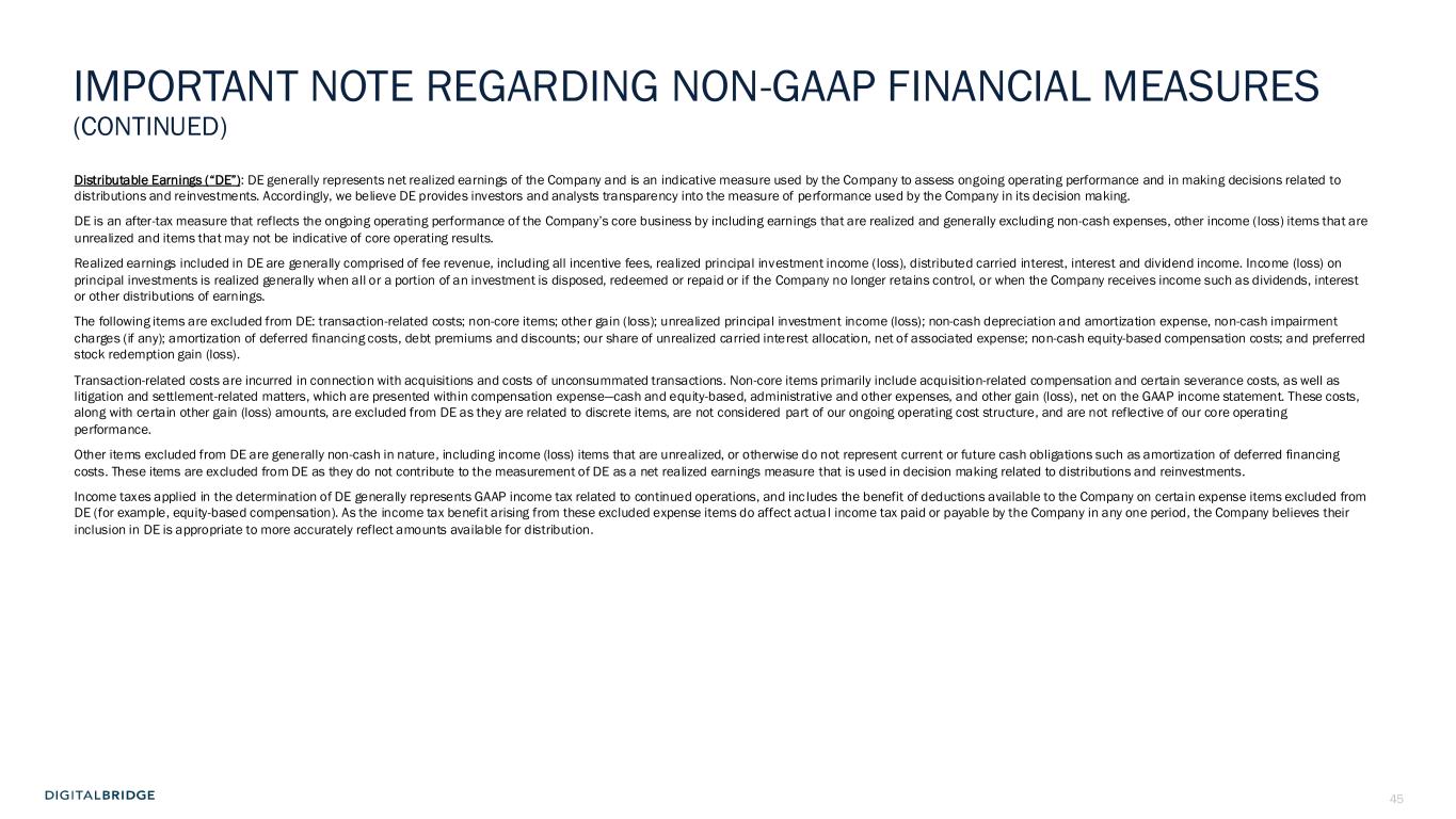 44 This presentation contains the following non-GAAP financial measures attributable to the Operating Company: Fee Related Earnings (“FRE”) and Distributable Earnings (“DE”). FRE and DE are common metrics utilized in the investment management sector. We present FRE and DE at the Operating Company level, which is net of amounts attributed to noncontrolling interests, composed largely of the limited partners' share of our consolidated funds and Wafra's share of earnings attributed to our general partner interest in certain funds. For the same reasons, the Company believes these non-GAAP measures are useful to the Company’s investors and analysts. As we evaluate profitability based upon continuing operations, these non-GAAP measures exclude results from discontinued operations. We believe the non-GAAP financial measures of FRE and DE supplement and enhance the overall understanding of our underlying financial performance and trends, and facilitate comparison among current, past and future periods and to other companies in similar lines of business. We use FRE and DE in evaluating the Company’s ongoing business performance and in making operating decisions. For the same reasons, we believe FRE and DE are useful financial measures to the Company’s investors and analysts. These non-GAAP financial measures should be considered as a supplement to and not an alternative or in lieu of GAAP net income (loss) as measures of operating performance, or to cash flows from operating activities as indicators of liquidity. Our calculation of these non-GAAP measures may differ from methodologies utilized by other companies for similarly titled performance measures and, as a result, may not be fully comparable to those calculated by our peers. Fee-Related Earnings (“FRE”): Beginning in 2024, FRE is reported on a Company-wide basis, consistent with the entirety of the Company's business representing a single reportable segment. In prior periods, the Company had reported Investment Management FRE, which was an FRE measure specific to its previously reported Investment Management segment. The Investment Management segment previously bore only operating costs that were directly attributable or otherwise can be subjected to a reasonable and systematic attribution to the investment management business. Company-wide FRE includes all operating costs of the Company as a whole that fall within the definition of FRE. FRE is used to assess the extent to which direct base compensation and core operating expenses are covered by recurring fee revenues in our investment management business. FRE represents recurring fee revenue, including incentive fees that are not subject to realization events related to underlying fund investments, net of compensation and administrative expenses. Such expenses generally exclude non-cash equity-based compensation, carried interest compensation, and placement fee expense. Also, consistent with DE, FRE excludes non-core items, and presents costs reimbursable by our managed funds on a net basis (as opposed to a gross-up of other income and administrative expenses). Where applicable, FRE is adjusted for Start-Up FRE as defined below. Fee revenues earned from consolidated funds are eliminated in consolidation. However, because the fees are funded by and earned from third party investors in these consolidated funds who represent noncontrolling interests, our allocated share of net income from the consolidated funds is increased by the amount of fees that are eliminated. The elimination of these fees, therefore, does not affect net income (loss) attributable to DBRG. Accordingly, FRE is presented without giving effect to the elimination of fee revenue to the extent such fees meet the definition of FRE. FRE does not include distributed carried interest as these are not recurring revenues and are subject to variability given that they are dependent upon realization events related to underlying fund investments. Placement fees are also excluded from FRE as they are inconsistent in amount and frequency depending upon timing of fundraising for our funds. Other items excluded from FRE include realized principal investment income (loss); and interest, dividend and other income, all of which are not core to the investment management fee service business. To reflect a stabilized investment management business, FRE is further adjusted to exclude Start-Up FRE, where applicable. Start-Up FRE is FRE associated with new investment strategies that have 1) not yet held a first close raising FEEUM; or 2) not yet achieved break-even FRE only for investment products that may be terminated solely at the Company’s discretion. The Company regularly evaluates new investment strategies and exclude Start-Up FRE until such time a new strategy is determined to form part of the Company’s core investment management business. We believe that FRE is a useful measure to investors as it reflects the Company’s profitability based upon recurring fee streams that are not subject to realization events related to underlying fund investments, and without the effects of income taxes, leverage, non-cash expenses, income (loss) items that are unrealized and other items that may not be indicative of core operating results in an investment management fee service business. IMPORTANT NOTE REGARDING NON-GAAP FINANCIAL MEASURES