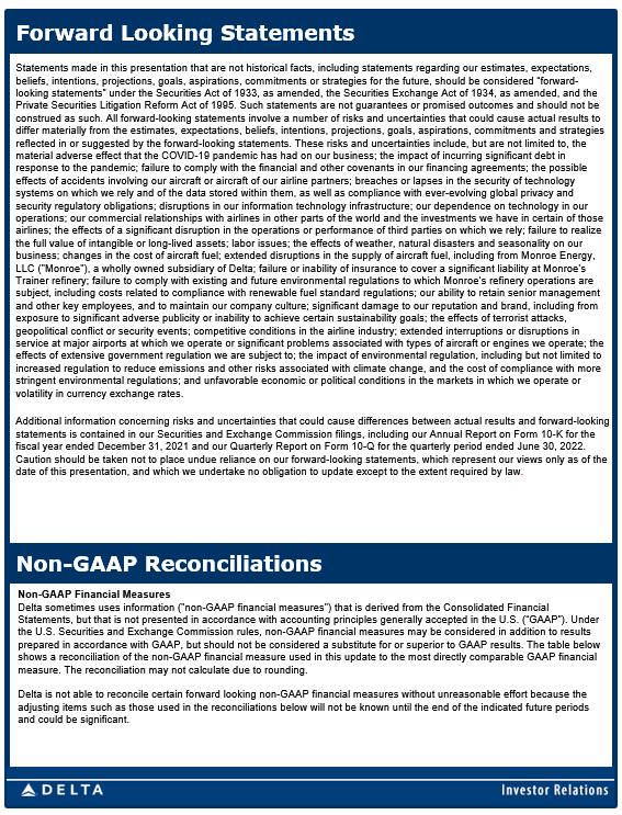 Forward Looking Statements Statements made in this presentation that are not historical facts, including statements regarding our estimates, expectation s, beliefs, intentions, projections, goals, aspirations, commitments or strategies for the future, should be considered “forward - looking statements” under the Securities Act of 1933, as amended, the Securities Exchange Act of 1934, as amended, and the Private Securities Litigation Reform Act of 1995. Such statements are not guarantees or promised outcomes and should not be construed as such. All forward - looking statements involve a number of risks and uncertainties that could cause actual results to differ materially from the estimates, expectations, beliefs, intentions, projections, goals, aspirations, commitments and str ate gies reflected in or suggested by the forward - looking statements. These risks and uncertainties include, but are not limited to, the material adverse effect that the COVID - 19 pandemic has had on our business; the impact of incurring significant debt in response to the pandemic; failure to comply with the financial and other covenants in our financing agreements; the possible effects of accidents involving our aircraft or aircraft of our airline partners; breaches or lapses in the security of techno log y systems on which we rely and of the data stored within them, as well as compliance with ever - evolving global privacy and security regulatory obligations; disruptions in our information technology infrastructure; our dependence on technology in ou r operations; our commercial relationships with airlines in other parts of the world and the investments we have in certain of tho se airlines; the effects of a significant disruption in the operations or performance of third parties on which we rely; failure to realize the full value of intangible or long - lived assets; labor issues; the effects of weather, natural disasters and seasonality on ou r business; changes in the cost of aircraft fuel; extended disruptions in the supply of aircraft fuel, including from Monroe En erg y, LLC ("Monroe"), a wholly owned subsidiary of Delta; failure or inability of insurance to cover a significant liability at Mon roe ’s Trainer refinery; failure to comply with existing and future environmental regulations to which Monroe’s refinery operations are subject, including costs related to compliance with renewable fuel standard regulations; our ability to retain senior managem ent and other key employees, and to maintain our company culture; significant damage to our reputation and brand, including from exposure to significant adverse publicity or inability to achieve certain sustainability goals; the effects of terrorist atta cks , geopolitical conflict or security events; competitive conditions in the airline industry; extended interruptions or disruptio ns in service at major airports at which we operate or significant problems associated with types of aircraft or engines we operate ; t he effects of extensive government regulation we are subject to; the impact of environmental regulation, including but not limit ed to increased regulation to reduce emissions and other risks associated with climate change, and the cost of compliance with more stringent environmental regulations; and unfavorable economic or political conditions in the markets in which we operate or volatility in currency exchange rates. Additional information concerning risks and uncertainties that could cause differences between actual results and forward - lookin g statements is contained in our Securities and Exchange Commission filings, including our Annual Report on Form 10 - K for the fiscal year ended December 31, 2021 and our Quarterly Report on Form 10 - Q for the quarterly period ended June 30, 2022. Caution should be taken not to place undue reliance on our forward - looking statements, which represent our views only as of the date of this presentation, and which we undertake no obligation to update except to the extent required by law . Non - GAAP Financial Measures Delta sometimes uses information ("non - GAAP financial measures") that is derived from the Consolidated Financial Statements, but that is not presented in accordance with accounting principles generally accepted in the U.S. (“GAAP”). Under the U.S. Securities and Exchange Commission rules, non - GAAP financial measures may be considered in addition to results prepared in accordance with GAAP, but should not be considered a substitute for or superior to GAAP results. The table below shows a reconciliation of the non - GAAP financial measure used in this update to the most directly comparable GAAP financial measure. The reconciliation may not calculate due to rounding. Delta is not able to reconcile certain forward looking non - GAAP financial measures without unreasonable effort because the adjusting items such as those used in the reconciliations below will not be known until the end of the indicated future perio ds and could be significant. Non - GAAP Reconciliations