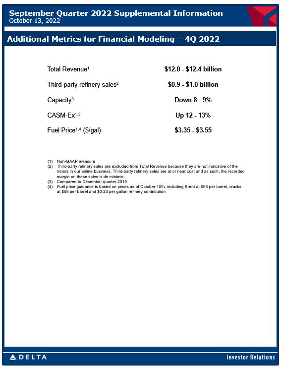 アトランタ、2022年10月13日 - デルタ航空(NYSE:DAL)は本日、2022年9月期の決算を発表し、2022年12月期の見通しを示しました。2022年9月期決算のハイライト(GAAP方式と調整後の指標の両方を含む)は5ページに掲載されており、ここに組み込んでいます。