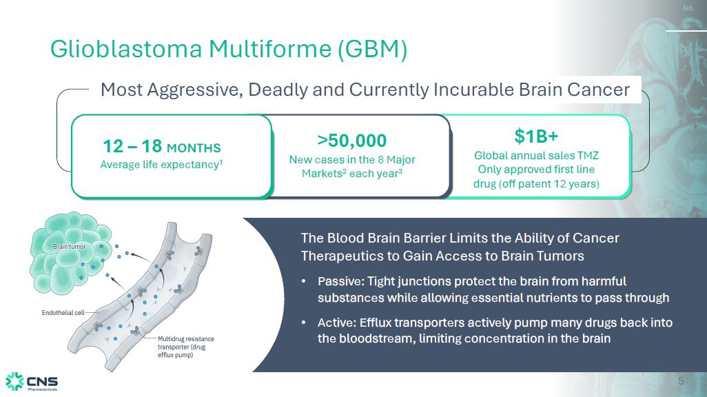 Overview Lead Program: Berubicin, a Novel Anthracycline • First drug of its class to appear to cross the blood - brain barrier • A clinical trial designed to be pivotal now fully enrolled • The primary analysis of data in the 1 st half of 2025 • No evidence of cardiotoxicity in hundreds of patients • Developed at MD Anderson Cancer Center – Ranked #1 in Cancer Care in the US Pipeline Expansion with In - License of TPI 287 • Late - stage, novel, blood brain - barrier permeable taxane - derivative (abeotaxane) for treatment of brain malignancies • Studies in over 350 patients to date, include clinical trials as monotherapy and combination with bevacizumab • Orphan Designation for 7 years granting US marketing exclusivity • Fast Track Designation expediting review of data 3 A Focused and Targeted CNS Oncology Pipeline Program Indication Preclinical Phase 1 Phase 2 Phase 3 Highlights Berubicin Glioblastoma Multiforme (GBM) • Study fully enrolled • Primary analysis data expected H1 2025 TPI 287 Glioblastoma Multiforme (GBM) • Recently in - licensed • Plan to engage with regulators to design potential registration study Potentially Pivotal 4