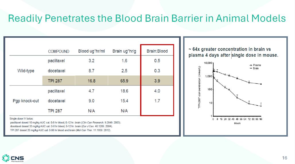 TPI 287 Late Stage, Novel Blood Brain Barrier Permeable Abeotaxane for Treatment of Brain Malignancies 14 TPI 287: A Novel Taxane Derivative TPI 287 Paclitaxel • Taxanes 15 • A class of chemotherapy that binds to microtubules and prevents them from breaking down normally, which stops cancer cells from dividing • A substrate for P - glycoprotein (Pgp), which is upregulated in cells that become taxane - resistant, and is part of the BBB • TPI 287 • A derivative of taxane (abeotaxane) that is not a substrate for Pgp • Effective in taxane - resistance and able to cross the BBB Readily Penetrates the Blood Brain Barrier in Animal Models 16