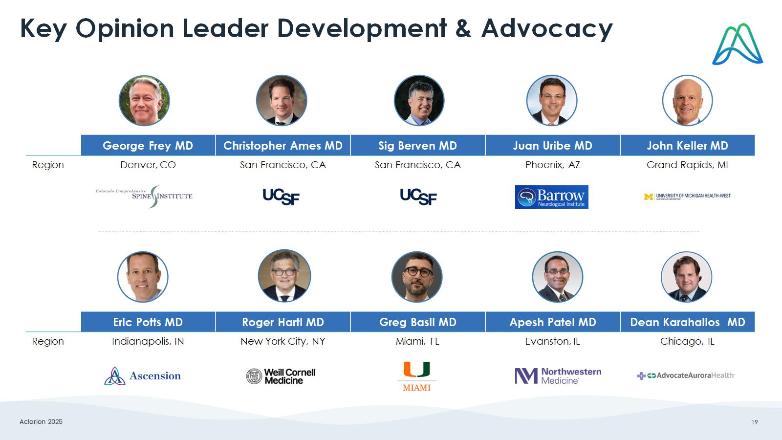 Self Pay PMI NHS 41% 28% 31% Aclarion 2025 17 London Clinic: Launch Full Commercial Effort Strong physician advocates Strategic, marketing initiatives Rapid and deep product adoption STRATEGY Leverage KOLs to increase market awareness and usage of Nociscan TACTICS Aclarion Direct Dinner Symposia Physician Training Direct Incentive to TLC Reps B2B Digital Marketing Aclarion 2025 18 Reimbursement Landscape Description CPT Code MRS, determination & localization of discogenic pain (cervical, thoracic, or lumbar); acquisition of single voxel data, per disc , in ≥3 discs – PAID TO IMAGING CENTER 0609T MRS, determination & localization of discogenic pain (cervical, thoracic, or lumbar); postprocessing for algorithmic analysis of biomarker data for determination of relative chemical differences between discs – PAID TO ACLARION 0611T CPT Category III Codes secured January 1, 2021 Transition to Category I codes Increase volume of Category III code billing Partner with surgeon KOL’s & societies to engage payers Aclarion 2025 19 Key Opinion Leader Development & Advocacy John Keller MD Juan Uribe MD Sig Berven MD Christopher Ames MD George Frey MD Grand Rapids, MI Phoenix, AZ San Francisco, CA San Francisco, CA Denver, CO Region Dean Karahalios MD Apesh Patel MD Greg Basil MD Roger Hartl MD Eric Potts MD Chicago, IL Evanston, IL Miami, FL New York City, NY Indianapolis, IN Region
