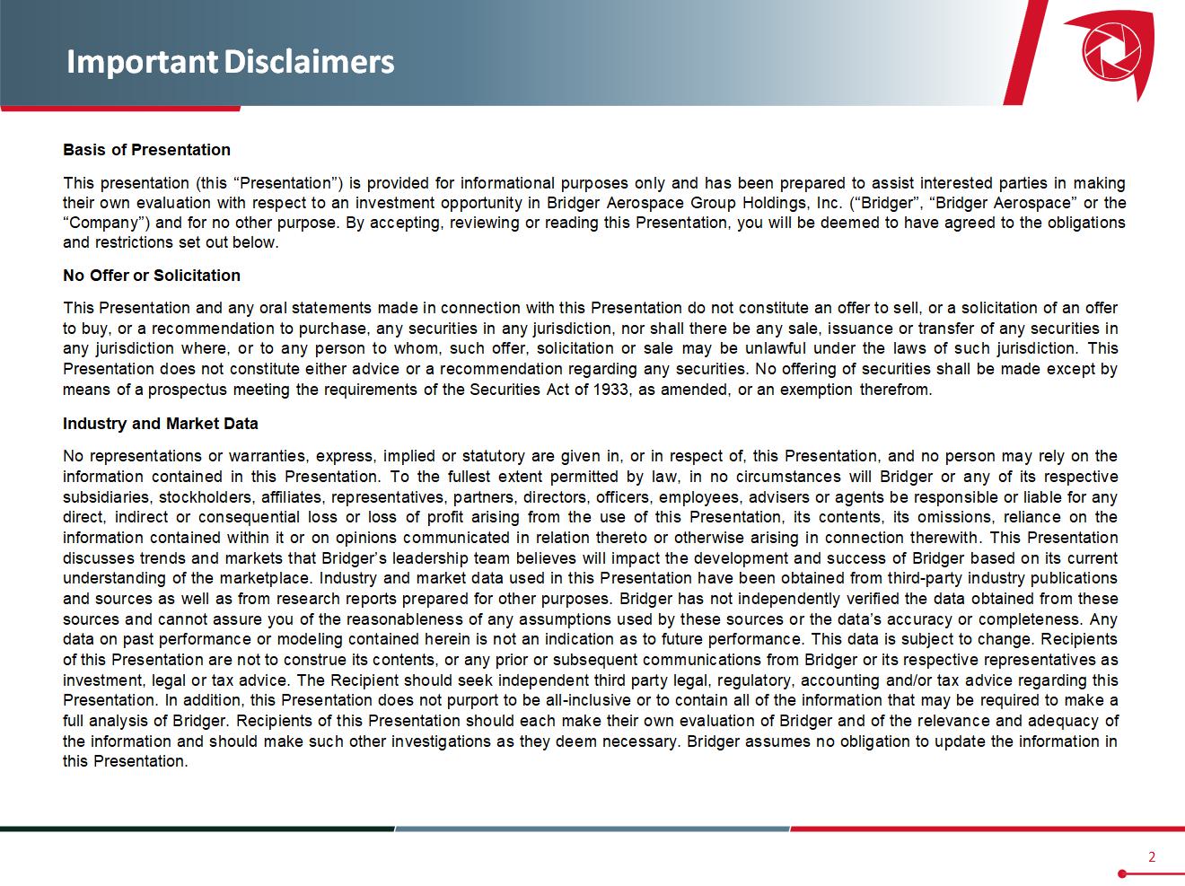 Basis of Presentation This presentation (this “Presentation”) is provided for informational purposes only and has been prepared to assist interested parties in making their own evaluation with respect to an investment opportunity in Bridger Aerospace Group Holdings, Inc . (“Bridger”, “Bridger Aerospace” or the “Company”) and for no other purpose . By accepting, reviewing or reading this Presentation, you will be deemed to have agreed to the obligations and restrictions set out below . No Offer or Solicitation This Presentation and any oral statements made in connection with this Presentation do not constitute an offer to sell, or a solicitation of an offer to buy, or a recommendation to purchase, any securities in any jurisdiction, nor shall there be any sale, issuance or transfer of any securities in any jurisdiction where, or to any person to whom, such offer, solicitation or sale may be unlawful under the laws of such jurisdiction . This Presentation does not constitute either advice or a recommendation regarding any securities . No offering of securities shall be made except by means of a prospectus meeting the requirements of the Securities Act of 1933 , as amended, or an exemption therefrom . Industry and Market Data No representations or warranties, express, implied or statutory are given in, or in respect of, this Presentation, and no person may rely on the information contained in this Presentation . To the fullest extent permitted by law, in no circumstances will Bridger or any of its respective subsidiaries, stockholders, affiliates, representatives, partners, directors, officers, employees, advisers or agents be responsible or liable for any direct, indirect or consequential loss or loss of profit arising from the use of this Presentation, its contents, its omissions, reliance on the information contained within it or on opinions communicated in relation thereto or otherwise arising in connection therewith . This Presentation discusses trends and markets that Bridger’s leadership team believes will impact the development and success of Bridger based on its current understanding of the marketplace . Industry and market data used in this Presentation have been obtained from third - party industry publications and sources as well as from research reports prepared for other purposes . Bridger has not independently verified the data obtained from these sources and cannot assure you of the reasonableness of any assumptions used by these sources or the data’s accuracy or completeness . Any data on past performance or modeling contained herein is not an indication as to future performance . This data is subject to change . Recipients of this Presentation are not to construe its contents, or any prior or subsequent communications from Bridger or its respective representatives as investment, legal or tax advice . The Recipient should seek independent third party legal, regulatory, accounting and/or tax advice regarding this Presentation . In addition, this Presentation does not purport to be all - inclusive or to contain all of the information that may be required to make a full analysis of Bridger . Recipients of this Presentation should each make their own evaluation of Bridger and of the relevance and adequacy of the information and should make such other investigations as they deem necessary . Bridger assumes no obligation to update the information in this Presentation .