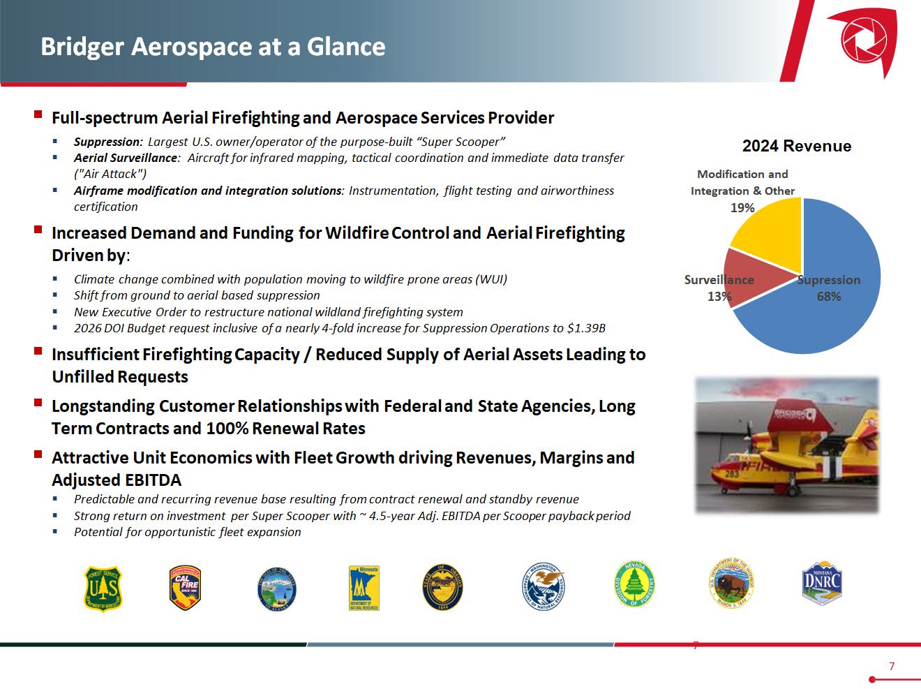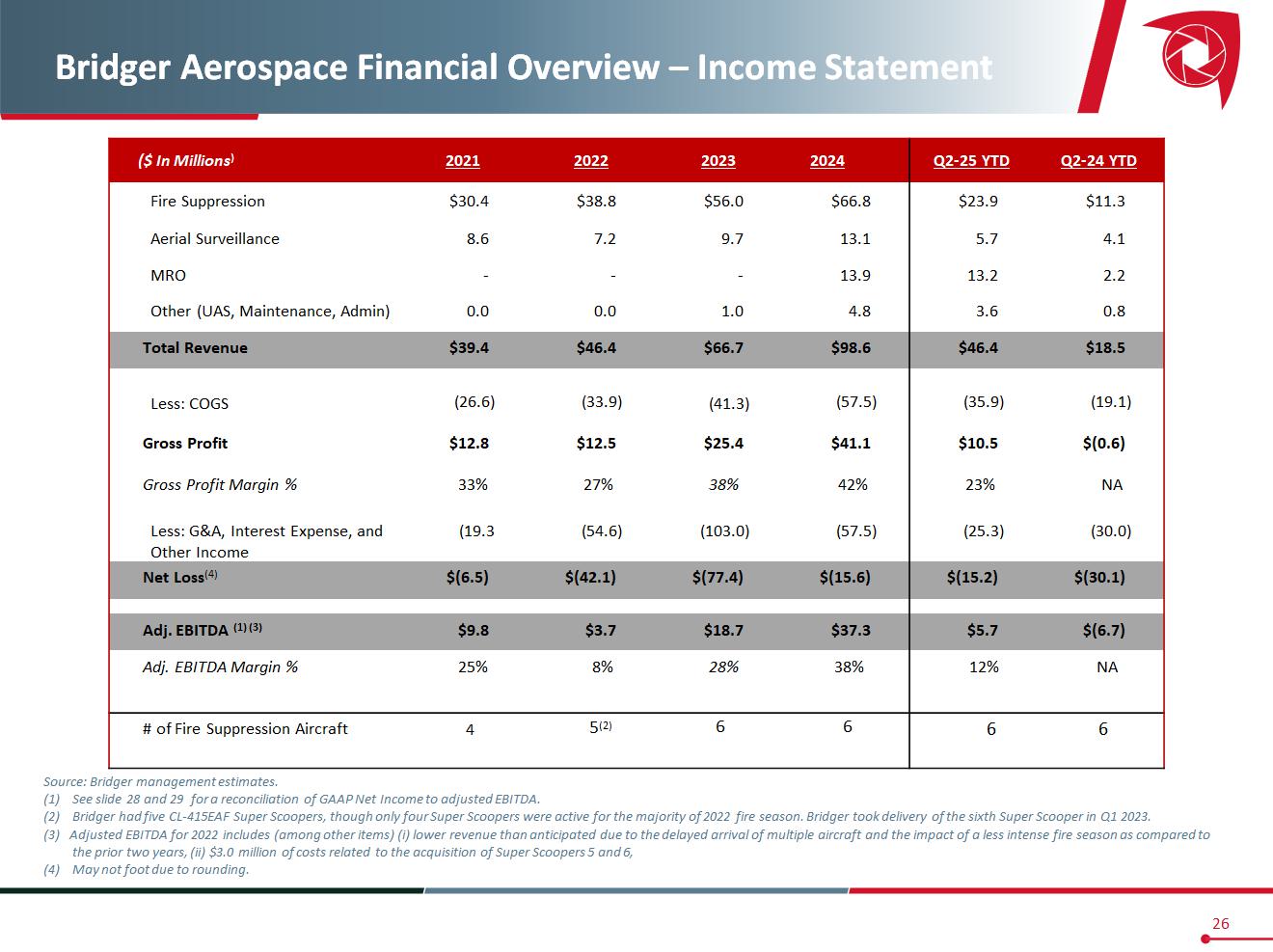 $45.2m 25 Bridger Aerospace Financial Overview – Income Statement Q2 - 24 YTD Q2 - 25 YTD 2024 2023 2022 2021 ($ In Millions ) $11.3 $23.9 $66.8 $ 56.0 $38.8 $30.4 Fire Suppression 4.1 5.7 13.1 9.7 7.2 8.6 Aerial Surveillance 2.2 13.2 13.9 - - - MRO 0.8 3.6 4.8 1 .0 0.0 0.0 Other ( UAS, Maintenance, Admin) $18.5 $46.4 $98.6 $ 66.7 $46.4 $39.4 Total Revenue (19.1) (35.9) (57.5) ( 41.3 ) (33.9) (26.6) Less: COGS $(0.6) $10.5 $41.1 $ 25.4 $12.5 $12.8 Gross Profit NA 23% 42% 38 % 27% 33% Gross Profit Margin % (30.0) (25.3) (57.5) ( 103.0 ) (54.6) (19.3 Less: G&A, Interest Expense, and Other Income $(30.1) $(15.2) $(15.6) $ (77.4) $(42.1) $(6.5) Net L oss ( 4) $(6.7) $5.7 $37.3 $ 18.7 $3.7 $9.8 Adj. EBITDA (1) ( 3 ) NA 12% 38% 28 % 8% 25% Adj. EBITDA Margin % 6 6 6 6 5 (2) 4 # of Fire Suppression Aircraft Source: Bridger manag