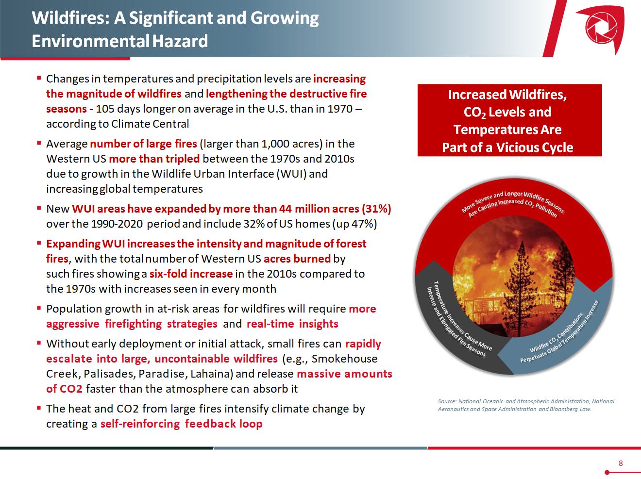 ▪ Changes in temperatures and precipitation levels are increasing the magnitude of wildfires and lengthening the destructive fire seasons - 105 days longer on average in the U.S. than in 1970 – according to Climate Central ▪ Average number of large fires (larger than 1,000 acres) in the Western US more than tripled between the 1970s and 2010s due to growth in the Wildlife Urban Interface (WUI) and increasing global temperatures ▪ New WUI areas have expanded by more than 44 million acres (31%) over the 1990 - 2020 period and include 32% of US homes (up 47%) ▪ Expanding WUI increases the intensity and magnitude of forest fires , with the t otal number of Western US acres burned by such fires showing a six - fold increase in the 2010s compared t o the 1970s with increases seen in every month ▪ Population growth in at - risk areas for wildfires will require more aggressive firefighting strategies and real - time insights ▪ Without early deployment or initial attack, small fires can rapidly escalate into large, uncontainable wildfires (e.g., Smokehouse Creek, Palisades, Paradise, Lahaina) and release massive amounts of CO2 faster than the atmosphere can absorb it ▪ The heat and CO2 from large fires intensify climate change by creating a self - reinforcing feedback loop 8 Lengthening of Wildfire Year is Driving Growth ▪ Wildfire is Becoming More Year Round ▪ 2024 saw fire activity as late as October and November ▪ Fires in California in January led to Bridger’s earliest deployment ever with devastation across nearly 36,000 acres and losses of $250 billion ▪ Early Detection and Prevention is More Important than Ever ▪ Population growth in at - risk areas for wildfires will require more aggressive firefighting strategies and real - time insights ▪ Applying technology is a disrupter ▪ Other countries deploy initial attack with water for prevention to limit spread and make fires less costly to fight ▪ Legislative Change and Increased Appropriations ▪ Recent federal actions including the 2025 Executive Order on Wildfire Response, Aerial Firefighting Enhancement Act of 2025 and Wildfire Response and Preparedness Act of 2025 have potential to strengthen wildfire response ▪ Additional proposals being introduced signal growing bipartisan momentum to strengthen national firefighting capabilities and cut red tape 9