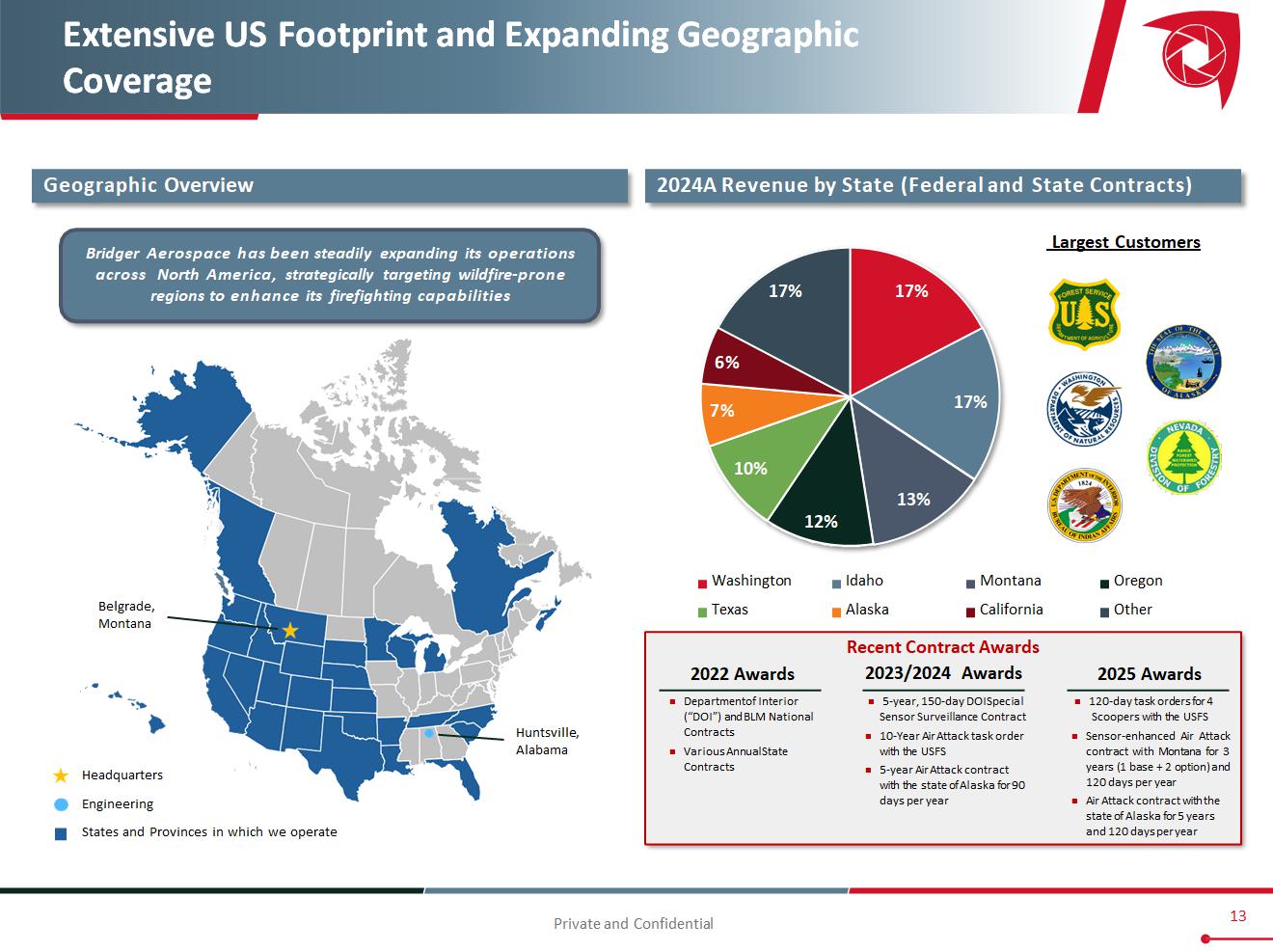 Year - Round Fires Are Extending Operators’ Flight Hours Climate Change has Elongated the Active Northern Hemisphere Fire Season 12 Extensive US Footprint and Expanding Geographic Coverage Geographic Overview 2024A Revenue by State (Federal and State Contracts) Bridger Aerospace has been steadily expanding its operations across North America, strategically targeting wildfire - prone regions to enhance its firefighting capabilities Departmentof Interior (“DOI”) and BLM National Contracts Various Annual State Contracts 5 - year, 150 - day DOISpecial Sensor Surveillance Contract 10 - Year Air Attack task order with the USFS 5 - year Air Attack contract with the state of Alaska for 90 days per year Belgrade, Montana Huntsville, Alabama Largest Customers 17% 17% 13% 12% 10% 7% 6% 17% Washington Texas Idaho Alaska Montana California Oregon Other 120 - day task orders for 4 Scoopers with the USFS Sensor - enhanced Air Attack contract with Montana for 3 years ( 1 base + 2 option) and 120 days per year Air Attack contract with the state of Alaska for 5 years and 120 days per year 2022 Awards 2025 Awards Recent Contract Awards 2023/2024 Awards Headquarters Engineering States and Provinces in which we operate Private and Confidential 13 Bridger’s Full Spectrum Aerial Firefighting Solution ▪ Suppression Aircraft (6 ) ▪ Purpose built DeHavilland “Super Scoopers” ▪ Highly capable and cost - efficient ▪ Track - record of safety and reliability ▪ High return on investment ▪ Air Attack and Surveillance ▪ Daher Kodiak 100 (4) and Pilatus PC - 12 (2) ▪ C ommand and control over a fire ▪ High reliability ▪ Special Missions (MMA) ▪ Pilatus PC - 12 (2) and Twin Commander (1) ▪ Cutting edge imaging systems and data transmission ▪ Advanced technologies lead to improved margins 14 Bridger Aerospace Deploys a Modern, Efficient Fleet that Integrates Data, Analytics and Reporting to Optimize Deployment in Order to Combat the Economic and Environmental Threat of Wildfires