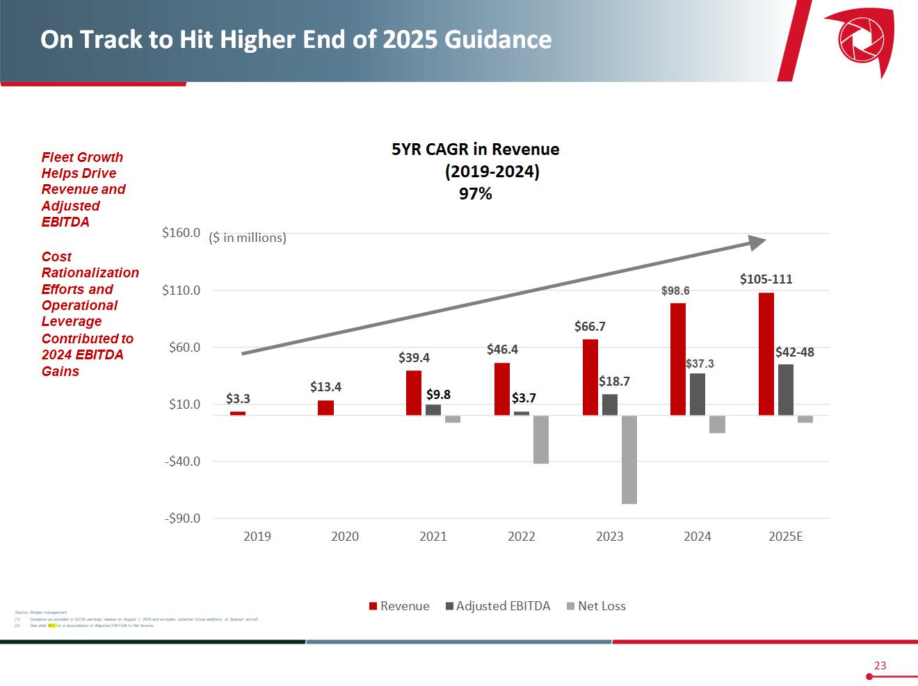 ement estimates. (1) See slide 28 and 29 for a reconciliation of GAAP Net Income to adjusted EBITDA. (2) Bridger had five CL - 415EAF Super Scoopers, though only four Super Scoopers were active for the majority of 2022 fire season. Bridger took delivery of the sixth Super Scooper in Q1 2023. (3) Adjusted EBITDA for 2022 includes (among other items) (i) lower revenue than anticipated due to the delayed arrival of multiple aircraft and the impact of a less intense fire season as compared to the prior two years, (ii) $3.0 million of costs related to the acquisition of Super Scoopers 5 and 6, (4) May not foot due to rounding. 26 Bridger Aerospace Financial Overview – Balance Sheet 6/30/25 12/31/24 12/31/23 12/31/22 12/31/21 ($ in Millions , FYE 12/31) Assets Current Assets: $30.9 $53.1 $37.9 $97.4 $17.3 Cash, Restricted Cash a n d Marketable Securities 18.3 5.9 4.1 0.0 0.0 Accounts and Notes Receivable 4.4 4.8 3.1 9.4 4.8 Other Current Assets 53.6 63.8 45.2 106.9 22.1 Total Current Assets 181.8 183.8 196.6 192.1 168.7 PP&E , net 43.7 43.2 31.7 7.0 4.4 Other Noncurrent Assets $279.0 $290.8 $ 273.5 $306.0 $195.1 Total Assets Liabilities, Equity and Stockholders ' Deficit Current Liabilities: 2.5 2.2 2.1 2.4 2.2 Current Portion of Long - Term Debt, Net of Debt Issuance Costs 22.1 21.2 23.3 21.9 70.9 Other Current Liabilities 24.6 23.4 25.4 24.3 73.1 Total Current Liabilities 201.0 202.5 204.6 205.5 58.1 Long - term Debt, Net of Debt Issuance Costs 11.0 11.4 16.6 0.8 2.1 Other Noncurrent Liabilities 236.7 237.3 246.5 230.6 133.3 Total Liabilities 0 0.0 0.0 0.0 146.7 Legacy Series A Preferred 393.4 380.2 354.8 0.0 0.0 Series A Preferred 0 0.0 0.0 489.0 0.0 Legacy Series C Preferred (351.0) (326.7) ( 327.9 ) (41 3.6 ) (84.8) Stockholders ' Deficit $279.0 $290.8 $273.5 $306.0 $195.1 Total Liabilities, Mezzanine Equity and Stockholders ' Deficit 27 Reconciliation to GAAP 28 1 Represents non - cash stock - based compensation expense associated with employee and non - employee equity awards.