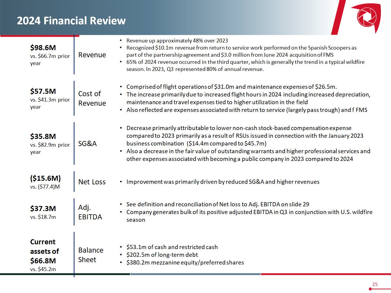 $63.8m 12/31/24 (1) See slide 28 for reconciliation of GAAP net Income to adjusted EBITDA 24 2024 Financial Review • Revenue up approximately 48% over 2023 • Recognized $10.1m revenue from return to service work performed on the Spanish Scoopers as part of the partnership agreement and $3.0 million from June 2024 acquisition of FMS • 65% of 2024 revenue occurred in the third quarter, which is generally the trend in a typical wildfire season. In 2023, Q3 represented 80% of annual revenue. Revenue $98.6M vs. $66.7m prior year • Comprised of flight operations of $31.0m and maintenance expenses of $26.5m. • The increase primarily due to increased flight hours in 2024 including increased depreciation, maintenance and travel expenses tied to higher utilization in the field • Also reflected are expenses associated with return to service (largely pass trough) and f FMS Cost of Revenue $57.5M vs. $41.3m prior year • Decrease primarily attributable to lower non - cash stock - based compensation expense compared to 2023 primarily as a result of RSUs issued in connection with the January 2023 business combination ($14.4m compared to $45.7m) • Also a decrease in the fair value of outstanding warrants and higher professional services and other expenses associated with becoming a public company in 2023 compared to 2024 SG&A $35.8M vs. $82.9m prior year • Improvement was primarily driven by reduced SG&A and higher revenues Net Loss ($15.6M) vs. ($77.4)M • See definition and reconciliation of Net loss to Adj. EBITDA on slide 29 • Company generates bulk of its positive adjusted EBITDA in Q3 in conjunction with U.S. wildfire season Adj. EBITDA $37.3M vs. $18.7m • $53.1m of cash and restricted cash • $202.5m of long - term debt • $380.2m mezzanine equity/preferred shares Balance Sheet Current assets of $66.8M vs.