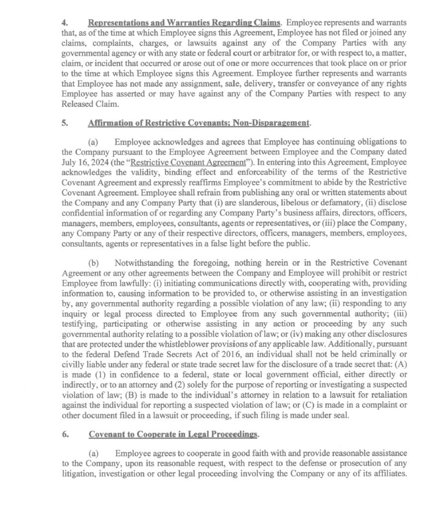 4 4 . Representations and Warranties Regarding Claims . Employee represents and warrants that, as of the time at which Employee signs this Agreement, Employee has not filed or joined any claims, complaints, charges, or lawsuits against any of the Company Parties with any governmental agency or with any state or federal court or arbitrator for, or with respect to, a matter, claim, or incident that occurred or arose out of one or more occurrences that took place on or prior to the time at which Employee signs this Agreement . Employee further represents and warrants that Employee has not made any assignment, sale, delivery, transfer or conveyance of any rights Employee has asserted or may have against any of the Company Parties with respect to any Released Claim . s. Affirmation of Restrictive Covenants ; Non - Disparagement . (a) Employee acknowledges and agrees that Employee has continuing obligations to the Company pursuant to the Employee Agreement between Employee and the Company dated July 16 , 2024 (the "Restrictive Covenant Agreement") . In entering into this Agreement, Employee acknowledges the validity, binding effect and enforceability of the terms of the Restrictive Covenant Agreement and expressly reaffirms Employee's commitment to abide by the Restrictive Covenant Agreement . Employee shall refrain from publishing any oral or written statements about the Company and any Company Party that (i) are slanderous, libelous or defamatory, (ii) disclose confidential information of or regarding any Company Party's business affairs, directors, officers, managers, members, employees, consultants, agents or representatives, or (iii) place the Company, any Company Party or any of their respective directors, officers, managers, members, employees, consultants, agents or representatives in a false light before the public . (b) Notwithstanding the foregoing, nothing herein or in the Restrictive Covenant Agreement or any other agreements between the Company and Employee will prohibit or restrict Employee from lawfully : (i) initiating communications directly with, cooperating with, providing information to, causing information to be provided to, or otherwise assisting in an investigation by, any governmental authority regarding a possible violation of any law ; (ii) responding to any inquiry or legal process directed to Employee from any such governmental authority ; (iii) testifying, participating or otherwise assisting in any action or proceeding by any such governmental authority relating to a possible violation oflaw ; or (iv) making any other disclosures that are protected under the whistleblower provisions of any applicable law . Additionally, pursuant to the federal Defend Trade Secrets Act of 2016 , an individual shall not be held criminally or civilly liable under any federal or state trade secret law for the disclosure of a trade secret that : (A) is made ( 1 ) in confidence to a federal, state or local government official, either directly or indirectly, or to an attorney and ( 2 ) solely for the purpose of reporting or investigating a suspected violation of law ; (B) is made to the individual's attorney in relation to a lawsuit for retaliation against the individual for reporting a suspected violation of law ; or (C) is made in a complaint or other document filed in a lawsuit or proceeding, if such filing is made under seal . 6. Covenant to Cooperate in Legal Proceedings . (a) Employee agrees to cooperate in good faith with and provide reasonable assistance to the Company, upon its reasonable request, with respect to the defense or prosecution of any litigation, investigation or other legal proceeding involving the Company or any of its affiliates .