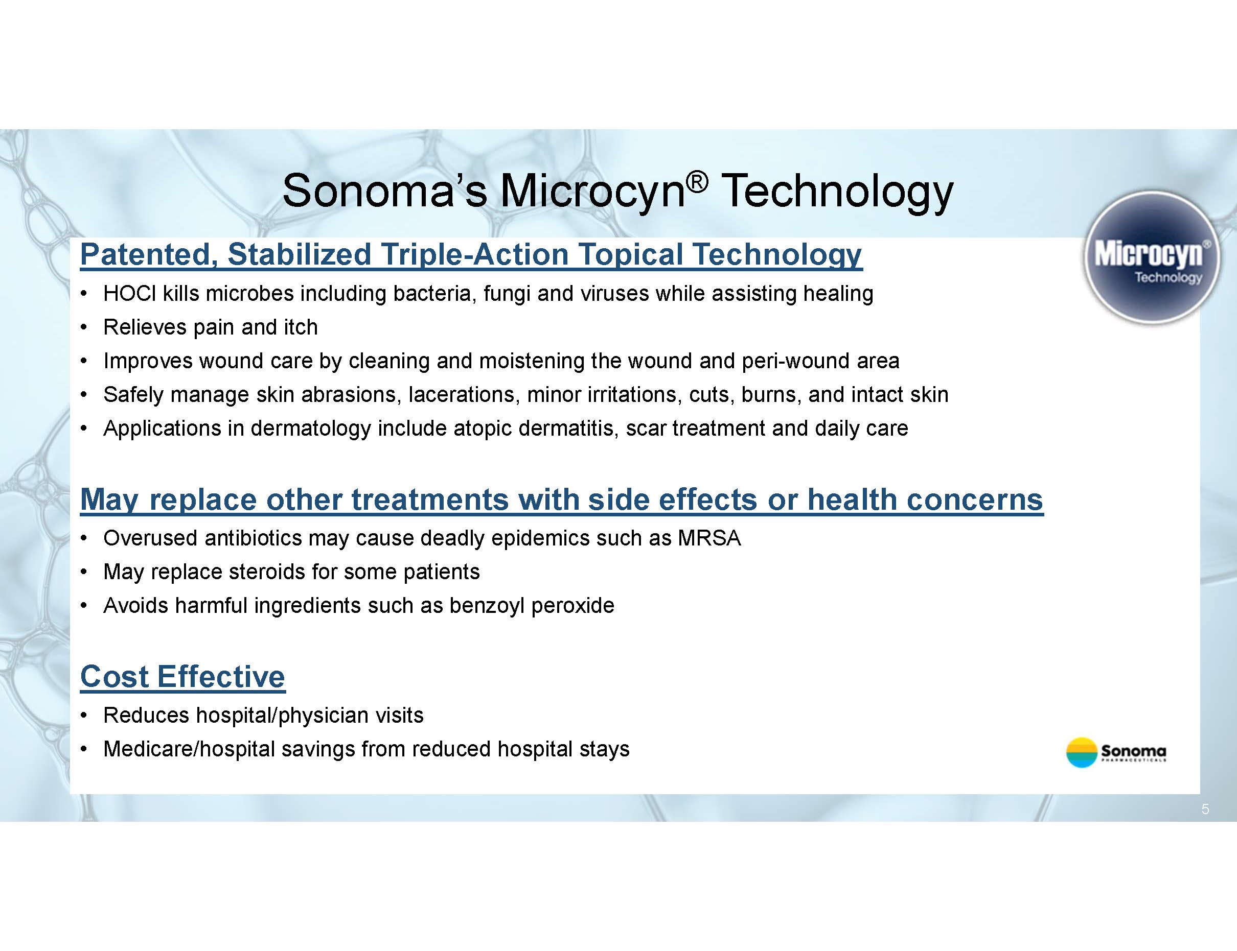 and international patents, and continual product innovation Robust and diverse international partner network selling into over 55 countries and extensive worldwide regulatory clearances means products can be commercialized faster FDA registered medical device manufacturing capabilities in Mexico lowers COGS and creates opportunities for volume plays 4 Sonoma’s Microcyn ® Technology Patented, Stabilized Triple - Action Topical Technology • HOCl kills microbes including bacteria, fungi and viruses while assisting healing • Relieves pain and itch • Improves wound care by cleaning and moistening the wound and peri - wound area • Safely manage skin abrasions, lacerations, minor irritations, cuts, burns, and intact skin • Applications in dermatology include atopic dermatitis, scar treatment and daily care May replace other treatments with side effects or health concerns • Overused antibiotics may cause deadly epidemics such as MRSA • May replace steroids for some patients • Avoids harmful ingredients such as benzoyl peroxide Cost Effective • Reduces hospital/physician visits • Medicare/hospital savings from reduced hospital stays 5 Sonoma’s Microcyn ® Technology Unparalleled Safety • No drug - to - drug interaction or contraindications • Millions of patients treated worldwide without a single report of serious adverse effect • 30+ human clinical trials with over 1,500 patients • Products contain all - natural hypochlorous acid Industry Leader • Strong U.S. and international regulatory portfolio • Longer shelf life than most competitors while retaining efficacy • Available in solution, hydrogels and in combination with silicone for scar treatment • White label available with custom packaging and design • Established Microcyn ® brand • State of the art manufacturing 6