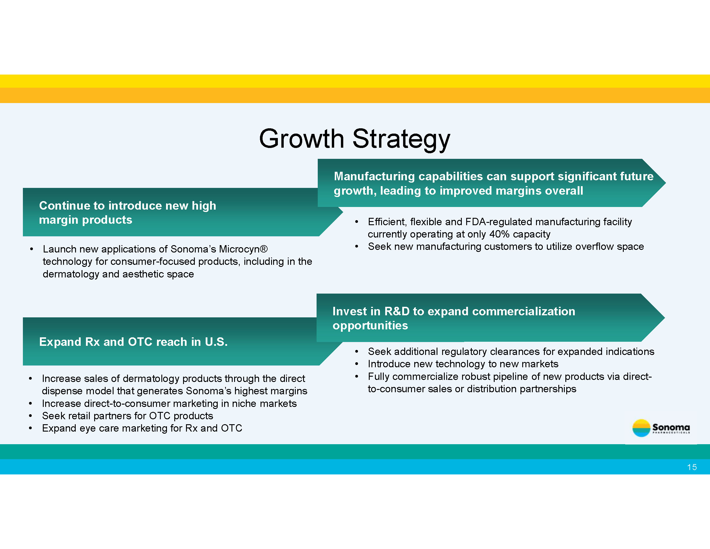 • 57,153 square foot state - of - the - art facility • ISO 9001, ISO 13485 and cGMP certified • MOH, KFDA, SFDA, KSA, TGA, EN, Biocide and numerous other national listings and approvals • Shipping to over 55 countries, with multiple methods for shipments • Highly trained staff of 162 employees • Additional 11,840 square feet of overflow capacity CUTTING EDGE MANUFACTURING Flexible operations capable of CUSTOM LABELING, SIZING, PACKAGING & DISPENSE MODES High or small volume, large or small batch, delivered in 12 weeks Currently operating at 40% capacity with margin of approximately 35% 13 Continue to introduce new high margin products Manufacturing capabilities can support significant future growth, leading to improved margins overall • Launch new applications of Sonoma’s Microcyn® technology for consumer - focused products, including in the dermatology and aesthetic space Growth Strategy • Efficient, flexible and FDA - regulated manufacturing facility currently operating at only 40% capacity • Seek new manufacturing customers to utilize overflow space Expand Rx and OTC reach in U.S. • Increase sales of dermatology products through the direct dispense model that generates Sonoma’s highest margins • Increase direct - to - consumer marketing in niche markets • Seek retail partners for OTC products • Expand eye care marketing for Rx and OTC 15 Invest in R&D to expand commercialization opportunities • Seek additional regulatory clearances for expanded indications • Introduce new technology to new markets • Fully commercialize robust pipeline of new products via direct - to - consumer sales or distribution partnerships New Market Opportunities Sonoma is expanding its partnerships and product offerings in the eye care, all - natural skin care, medical spa and animal health care industries.