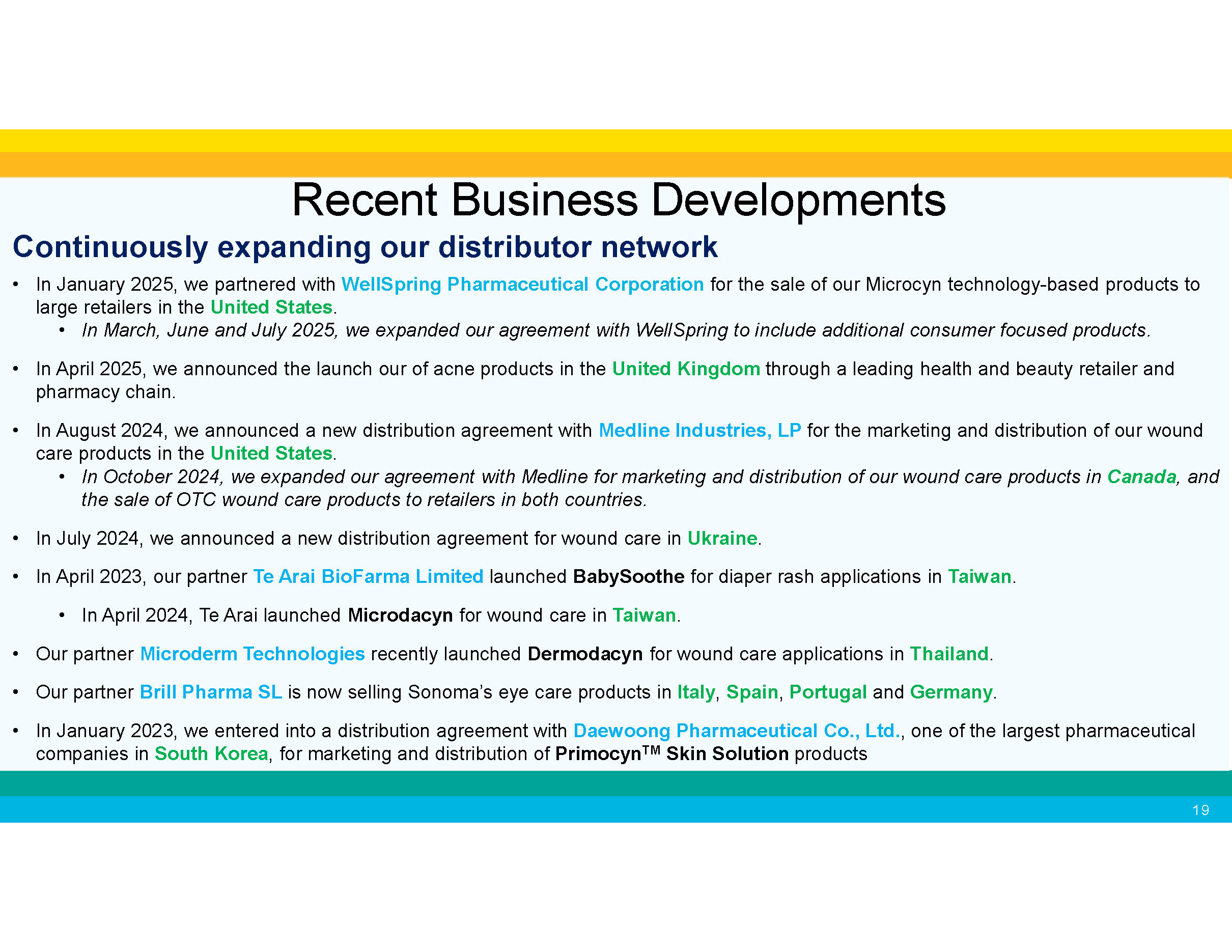 doi:10.1002/nau.25450 Recent Business Developments 18 Continuously expanding our distributor network 19 • In January 2025, we partnered with WellSpring Pharmaceutical Corporation for the sale of our Microcyn technology - based products to large retailers in the United States . • In March, June and July 2025, we expanded our agreement with WellSpring to include additional consumer focused products. • In April 2025, we announced the launch our of acne products in the United Kingdom through a leading health and beauty retailer and pharmacy chain. • In August 2024, we announced a new distribution agreement with Medline Industries, LP for the marketing and distribution of our wound care products in the United States . • In October 2024, we expanded our agreement with Medline for marketing and distribution of our wound care products in Canada , and the sale of OTC wound care products to retailers in both countries. • In July 2024, we announced a new distribution agreement for wound care in Ukraine . • In April 2023, our partner Te Arai BioFarma Limited launched BabySoothe for diaper rash applications in Taiwan . • In April 2024, Te Arai launched Microdacyn for wound care in Taiwan . • Our partner Microderm Technologies recently launched Dermodacyn for wound care applications in Thailand . • Our partner Brill Pharma SL is now selling Sonoma’s eye care products in Italy , Spain , Portugal and Germany . • In January 2023, we entered into a distribution agreement with Daewoong Pharmaceutical Co., Ltd.