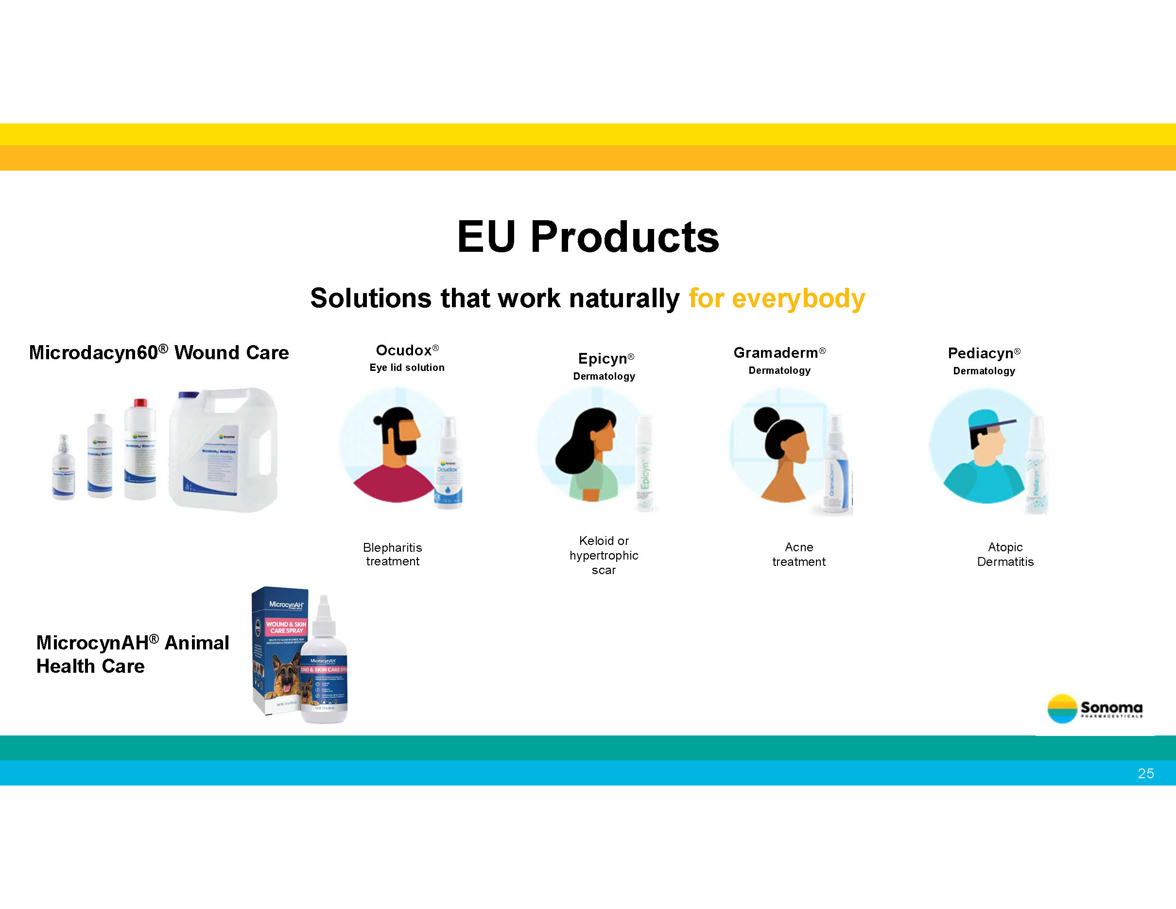 U.S. Animal Health Care MicrocynAH ® family of advanced animal healthcare products, safe to use on pets and livestock, and perfect for hot spots, pink eye, scratches, skin rashes and ulcers, cuts, burns, post - surgical sites, irritated skin and lacerations. • Sold in national pet - store retail chains and specialty stores such as PetSmart , Tractor Supply , and Menards . MicrocynVS ® veterinarian - strength animal care for use in vet clinics and animal hospitals. 24 Epicyn ® Dermatology Gramaderm ® Dermatology Pediacyn ® Dermatology Blepharitis treatment Ocudox ® Eye lid solution Keloid or hypertrophic scar Acne treatment Atopic Dermatitis Solutions that work naturally for everybody EU Products Microdacyn60 ® Wound Care MicrocynAH ® Animal Health Care 25