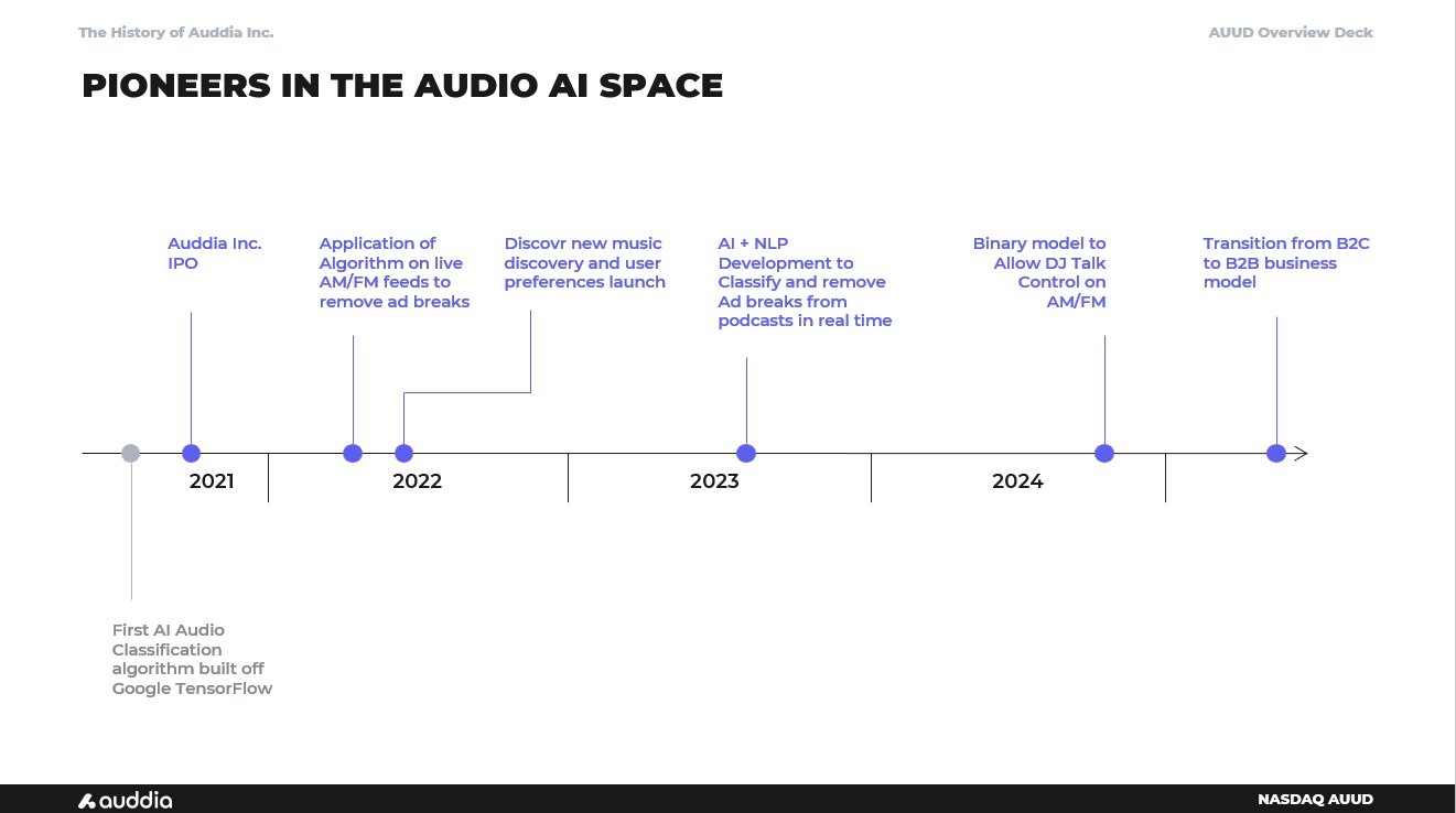 AUUD Overview Deck NASDAQ AUUD 2021 The History of Auddia Inc. PIONEERS IN THE AUDIO AI SPACE Auddia Inc. IPO 2022 2023 2024 First AI Audio Classification algorithm built off Google TensorFlow Application of Algorithm on live AM/FM feeds to remove ad breaks Discovr new music discovery and user preferences launch AI + NLP Development to Classify and remove Ad breaks from podcasts in real time Binary model to Allow DJ Talk Control on AM/FM Transition from B2C to B2B business model