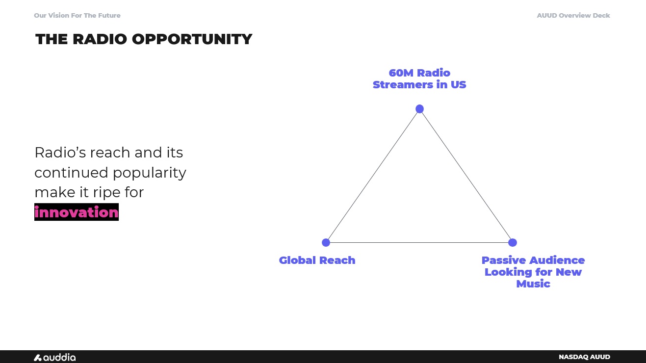 AUUD Overview Deck NASDAQ AUUD Radio’s reach and its continued popularity make it ripe for innovation Global Reach 60M Radio Streamers in US Passive Audience Looking for New Music THE RADIO OPPORTUNITY Our Vision For The Future