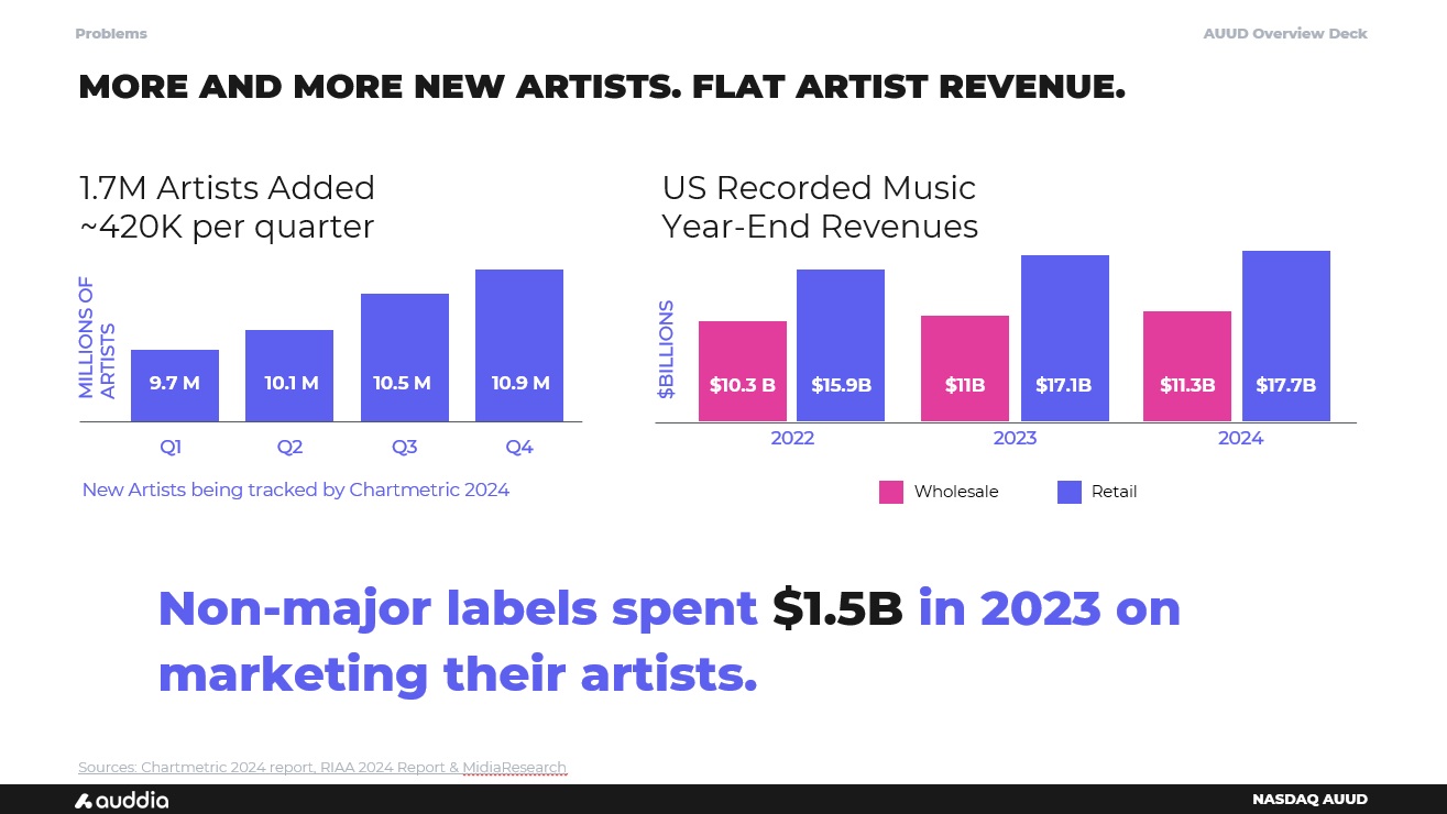 AUUD Overview Deck NASDAQ AUUD Sources: Chartmetric 2024 report, RIAA 2024 Report & MidiaResearch New Artists being tracked by Chartmetric 2024 $10.3 B US Recorded Music Year - End Revenues $15.9B $11B $17.1B $11.3B $17.7B Wholesale Retail 2022 2023 2024 1.7M Artists Added ~420K per quarter MORE AND MORE NEW ARTISTS. FLAT ARTIST REVENUE. Problems Q1 Q2 Q3 Q4 9.7 M 10.1 M 10.5 M 10.9 M Non - major labels spent $1.5B in 2023 on marketing their artists.