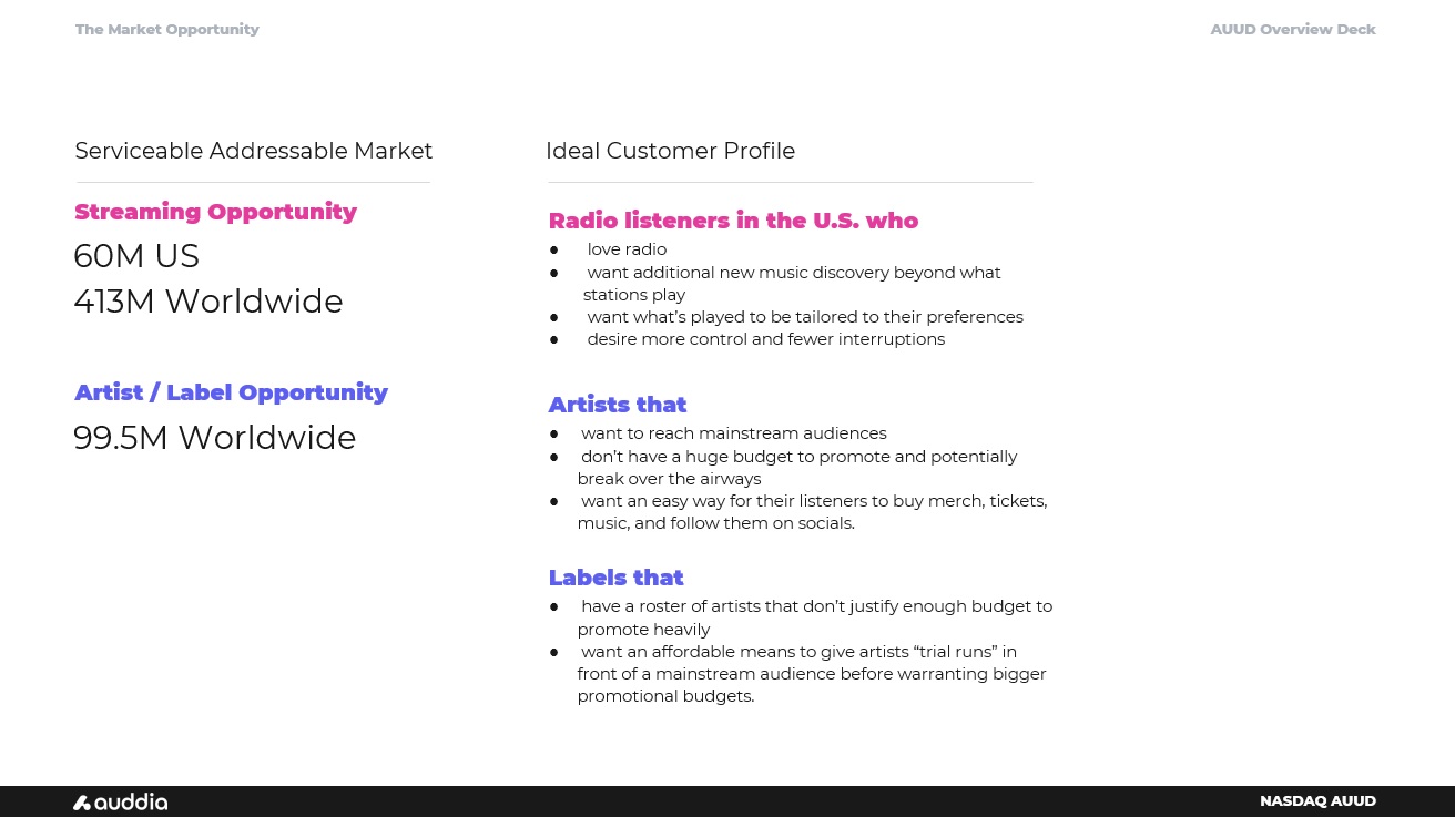 AUUD Overview Deck NASDAQ AUUD Radio listeners in the U.S. who ● love radio ● want additional new music discovery beyond what stations play ● want what’s played to be tailored to their preferences ● desire more control and fewer interruptions Artists that ● want to reach mainstream audiences ● don’t have a huge budget to promote and potentially break over the airways ● want an easy way for their listeners to buy merch, tickets, music, and follow them on socials. Labels that ● have a roster of artists that don’t justify enough budget to promote heavily ● want an affordable means to give artists “trial runs” in front of a mainstream audience before warranting bigger promotional budgets. Streaming Opportunity Artist / Label Opportunity 60M US 413M Worldwide 99.5M Worldwide Serviceable Addressable Market Ideal Customer Profile The Market Opportunity