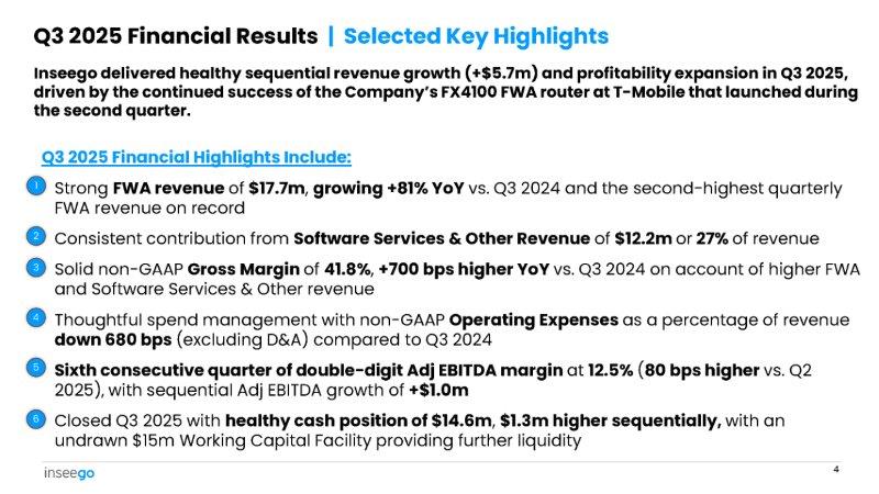 「InseegoのCEO、Juho Sarvikasは次のように述べています。「第3四半期もInseegoにとって好調な四半期となり、当社の主要な戦略的成長と価値創造のイニシアチブの堅実な実行を反映しています。「FX4100の好調な需要により、当社は重要な勝利を収め、エンタープライズFWAにおけるリーダーシップを拡大し、プレミアムFX4200 5Gソリューションを発表し、FWAとモバイルの両方でTier-1キャリア基盤を拡大しました。また、リーダーシップチームと取締役会に重要なメンバーを加え、インセイゴが目の前の大きなチャンスに実行に移せるようさらに体制を整えました。私たちは、2025年を成功裏に締めくくるために、持続可能な成長と収益性を促進するために、クラウド管理型ワイヤレス・ブロードバンド・ソリューションの規模を拡大し続けることに注力しています」。