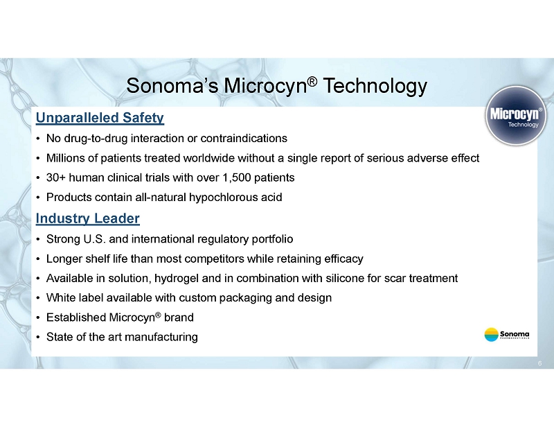 and international patents, and continual product innovation Robust and diverse international partner network selling into over 55 countries and extensive worldwide regulatory clearances means products can be commercialized faster FDA registered medical device and cosmetic manufacturing capabilities in Mexico lower COGS and create opportunities for volume plays Sonoma’s Microcyn ® Technology Patented, Stabilized Triple - Action Topical Technology • HOCl kills microbes including bacteria, fungi and viruses while assisting healing • Relieves pain and itch • Improves wound care by cleaning and moistening the wound and peri - wound area • Safely manage skin abrasions, lacerations, minor irritations, cuts, burns, and intact skin • Applications in dermatology include atopic dermatitis, scar treatment and daily care May replace other treatments with side effects or health concerns • Overused antibiotics may cause deadly epidemics such as MRSA • May replace steroids for some patients • Avoids harmful ingredients such as benzoyl peroxide Cost Effective • Reduces hospital/physician visits • Medicare/hospital savings from reduced hospital stays 5 Sonoma’s Microcyn ® Technology Unparalleled Safety • No drug - to - drug interaction or contraindications • Millions of patients treated worldwide without a single report of serious adverse effect • 30+ human clinical trials with over 1,500 patients • Products contain all - natural hypochlorous acid Industry Leader • Strong U.S. and international regulatory portfolio • Longer shelf life than most competitors while retaining efficacy • Available in solution, hydrogel and in combination with silicone for scar treatment • White label available with custom packaging and design • Established Microcyn ® brand • State of the art manufacturing 6
