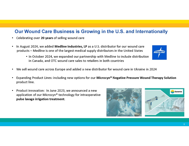 Our Wound Care Business is Growing in the U.S. and Internationally • Celebrating over 20 years of selling wound care • In August 2024, we added Medline Industries, LP as a U.S. distributor for our wound care products – Medline is one of the largest medical supply distributors in the United States • In October 2024, we expanded our partnership with Medline to include distribution in Canada, and OTC wound care sales to retailers in both countries • We sell wound care across Europe and added a new distributor for wound care in Ukraine in 2024 • Expanding Product Lines: including new options for our Microcyn® Negative Pressure Wound Therapy Solution product line. • Product innovation: In June 2023, we announced a new application of our Microcyn® technology for intraoperative pulse lavage irrigation treatment .