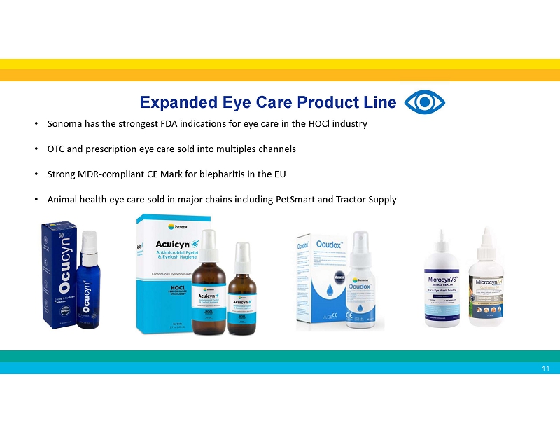 Industry - Leading Safe and Effective Dermatology Products • Products to relieve symptoms of atopic dermatitis, reduce scarring, and for daily skin care • Line of office dispense products targeting growing med spa market • National Eczema Association Seal of Acceptance • National Psoriasis Foundation Seal of Recognition • National Rosacea Society Seal of Acceptance • All natural ingredients • No harmful chemicals • OTC, office dispense, and Rx products available • Innovating packaging available including both high end and cost competitive options Expanded Eye Care Product Line • Sonoma has the strongest FDA indications for eye care in the HOCl industry • OTC and prescription eye care sold into multiples channels • Strong MDR - compliant CE Mark for blepharitis in the EU • Animal health eye care sold in major chains including PetSmart and Tractor Supply