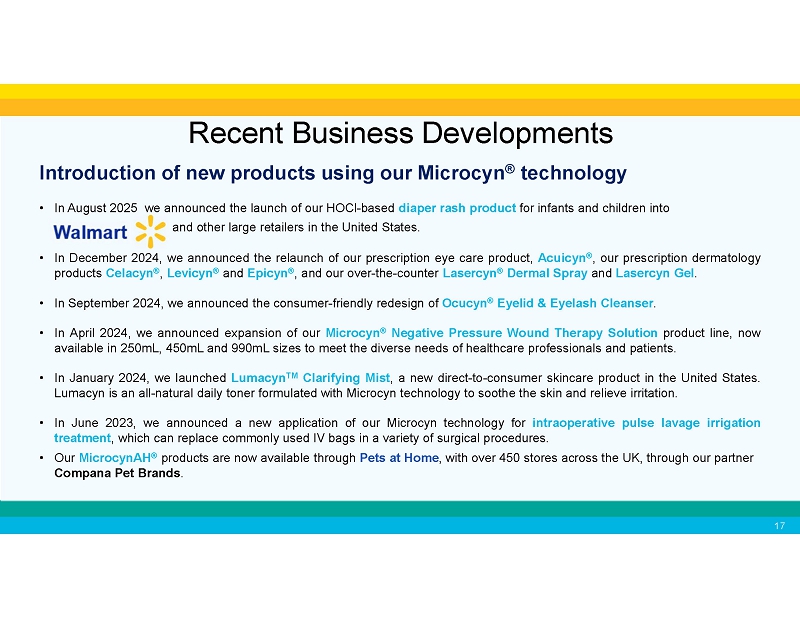 Recent Business Developments Expanding commercialization opportunities by investing in R&D • We successfully transitioned all of our commercialized products in Europe, including eye care, wound care, scar gel, acne products and atopic dermatitis products to the new European Union (EU) Medical Device Regulation (MDR) . • Our manufacturing facility and five of our products are successfully registered with the Medicines & Healthcare products Regulatory Agency (MHRA) in the United Kingdom, including our wound irrigation solution and hydrogel, scar management products and acne products . • In October 2025, we successfully registered our manufacturing facility and listed our Microcyn - based facial spray under the FDA's Modernization of Cosmetics Regulation Act of 2022 (MoCRA) • In 2024 we received two new 510(k) clearances from the FDA, including specific over - the - counter indications for the face, eyelid and eyelashes, as well as improved biocompatibility for our Microcyn - based solution and hydrogel. • Reliefacyn® Advanced Itch - Burn - Rash - Pain Relief Hydrogel was awarded the N ATIONAL E CZEMA A SSOCIATION S EAL OF A CCEPTANCE TM , the N ATIONAL P SORIASIS F OUNDATION S EAL OF R ECOGNITION , and the N ATIONAL R OSACEA S OCIETY S EAL OF A CCEPTANCE . • A recent publication in the journal Neurourology and Urodynamics highlighted the potential for Microdox® in the management of urinary tract infections, or UTIs, in children with neurogenic or non-neurogenic bladder dysfunction. 1 1. Singh G-K, Deshpande A, Schlegel G, Starkey M, Taghavi K. The rationale for bladder washouts in children with neurogenic bladder. Neurourol Urodyn. 2024;1-6.