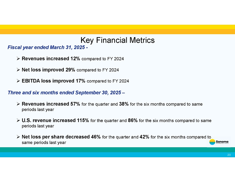 , one of the largest pharmaceutical companies in South Korea , for marketing and distribution of Primocyn TM Skin Solution products Recent Business Developments Key Financial Metrics 2 0 Fiscal year ended March 31, 2025 - □ Revenues increased 12% compared to FY 2024 □ Net loss improved 29% compared to FY 2024 □ EBITDA loss improved 17% compared to FY 2024 Three and six months ended September 30, 2025 – □ Revenues increased 57% for the quarter and 38% for the six months compared to same periods last year □ U.S.