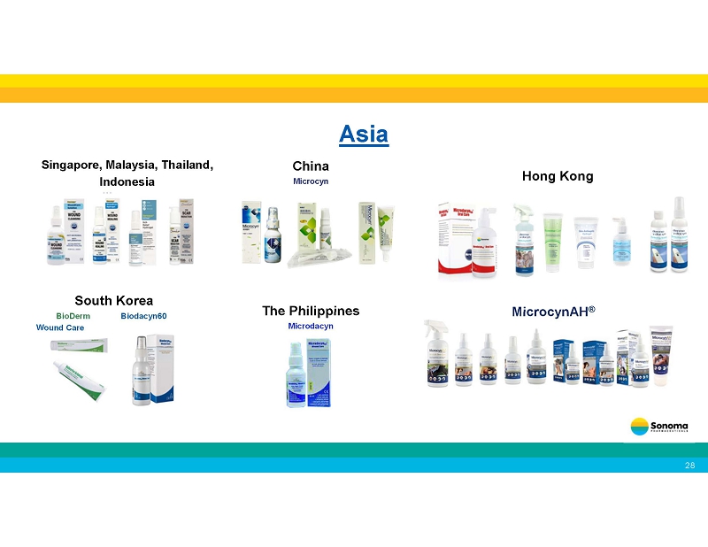 Direct - to - consumer products available through Shopify and Amazon EU U.S. P r od u c t s EU Products Singapore, Malaysia, Thailand, Indonesia Wound Care South Korea W o Hong Kong C h i n a Microcyn The Philippines BioDerm Biodacyn60 MicrocynAH und Care Microdacyn ® Asia