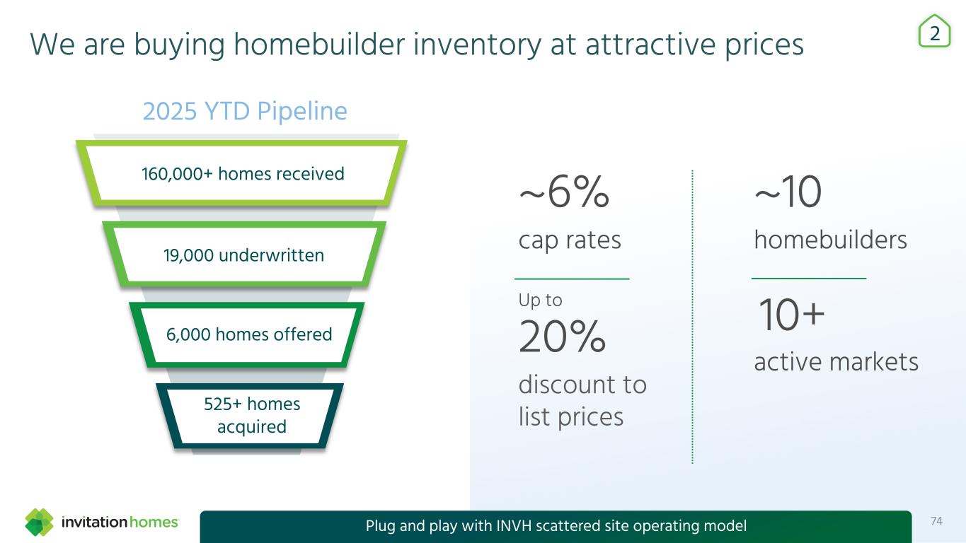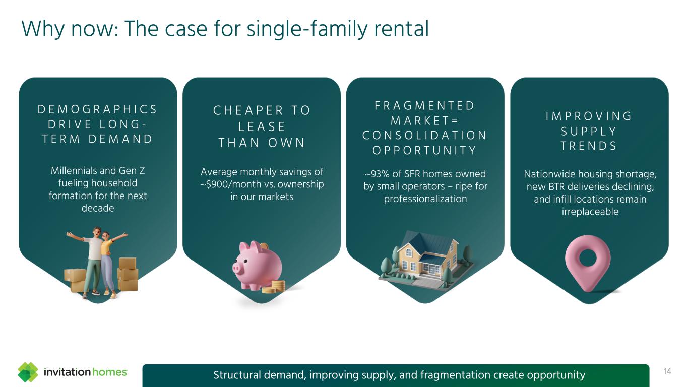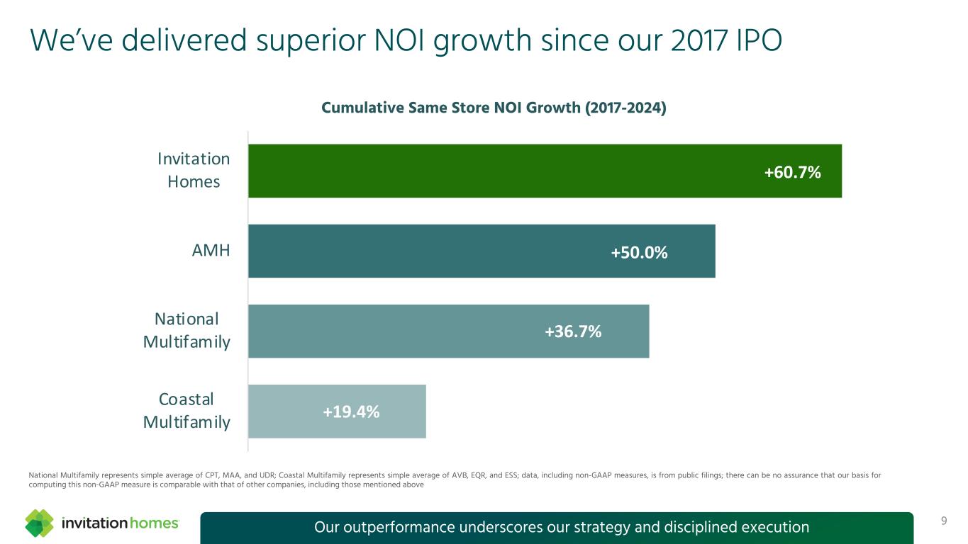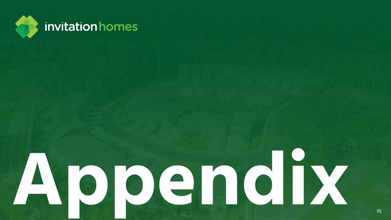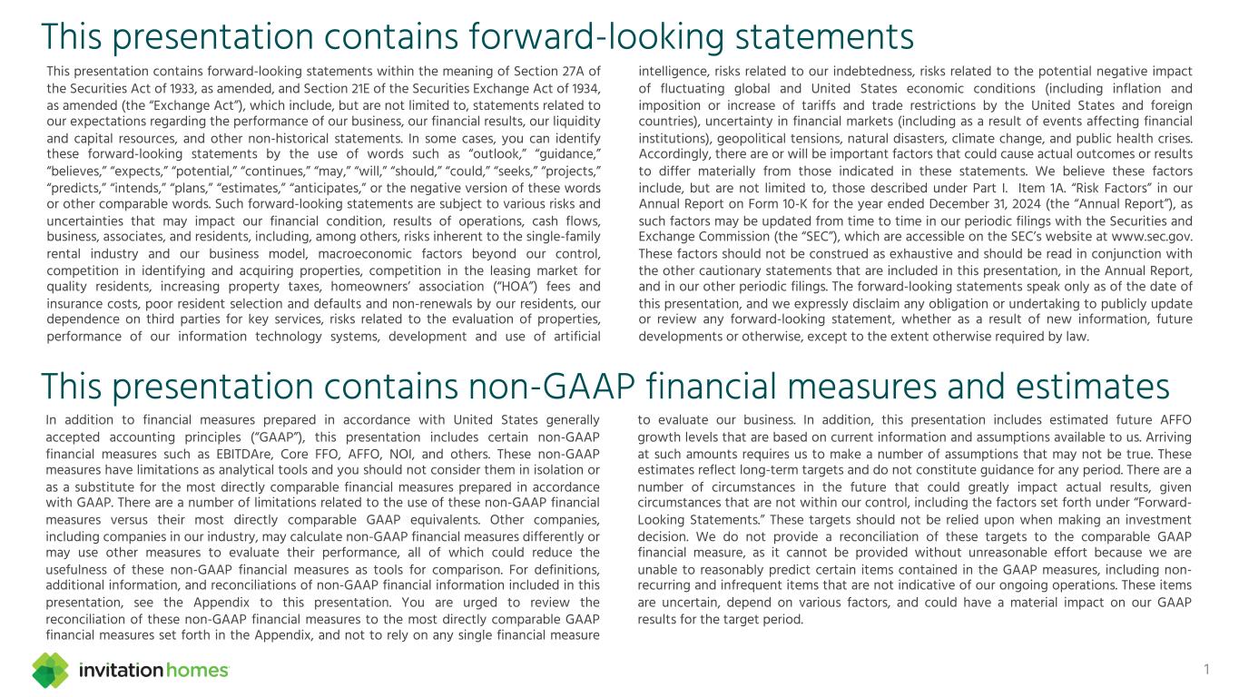 This presentation contains forward-looking statements This presentation contains forward-looking statements within the meaning of Section 27A of the Securities Act of 1933, as amended, and Section 21E of the Securities Exchange Act of 1934, as amended (the “Exchange Act”), which include, but are not limited to, statements related to our expectations regarding the performance of our business, our financial results, our liquidity and capital resources, and other non-historical statements. In some cases, you can identify these forward-looking statements by the use of words such as “outlook,” “guidance,” “believes,” “expects,” “potential,” “continues,” “may,” “will,” “should,” “could,” “seeks,” “projects,” “predicts,” “intends,” “plans,” “estimates,” “anticipates,” or the negative version of these words or other comparable words. Such forward-looking statements are subject to various risks and uncertainties that may impact our financial condition, results of operations, cash flows, business, associates, and residents, including, among others, risks inherent to the single-family rental industry and our business model, macroeconomic factors beyond our control, competition in identifying and acquiring properties, competition in the leasing market for quality residents, increasing property taxes, homeowners’ association (“HOA”) fees and insurance costs, poor resident selection and defaults and non-renewals by our residents, our dependence on third parties for key services, risks related to the evaluation of properties, performance of our information technology systems, development and use of artificial intelligence, risks related to our indebtedness, risks related to the potential negative impact of fluctuating global and United States economic conditions (including inflation and imposition or increase of tariffs and trade restrictions by the United States and foreign countries), uncertainty in financial markets (including as a result of events affecting financial institutions), geopolitical tensions, natural disasters, climate change, and public health crises. Accordingly, there are or will be important factors that could cause actual outcomes or results to differ materially from those indicated in these statements. We believe these factors include, but are not limited to, those described under Part I. Item 1A. “Risk Factors” in our Annual Report on Form 10-K for the year ended December 31, 2024 (the “Annual Report”), as such factors may be updated from time to time in our periodic filings with the Securities and Exchange Commission (the “SEC”), which are accessible on the SEC’s website at www.sec.gov. These factors should not be construed as exhaustive and should be read in conjunction with the other cautionary statements that are included in this presentation, in the Annual Report, and in our other periodic filings. The forward-looking statements speak only as of the date of this presentation, and we expressly disclaim any obligation or undertaking to publicly update or review any forward-looking statement, whether as a result of new information, future developments or otherwise, except to the extent otherwise required by law. 1 This presentation contains non-GAAP financial measures and estimates In addition to financial measures prepared in accordance with United States generally accepted accounting principles (“GAAP”), this presentation includes certain non-GAAP financial measures such as EBITDAre, Core FFO, AFFO, NOI, and others. These non-GAAP measures have limitations as analytical tools and you should not consider them in isolation or as a substitute for the most directly comparable financial measures prepared in accordance with GAAP. There are a number of limitations related to the use of these non-GAAP financial measures versus their most directly comparable GAAP equivalents. Other companies, including companies in our industry, may calculate non-GAAP financial measures differently or may use other measures to evaluate their performance, all of which could reduce the usefulness of these non-GAAP financial measures as tools for comparison. For definitions, additional information, and reconciliations of non-GAAP financial information included in this presentation, see the Appendix to this presentation. You are urged to review the reconciliation of these non-GAAP financial measures to the most directly comparable GAAP financial measures set forth in the Appendix, and not to rely on any single financial measure to evaluate our business. In addition, this presentation includes estimated future AFFO growth levels that are based on current information and assumptions available to us. Arriving at such amounts requires us to make a number of assumptions that may not be true. These estimates reflect long-term targets and do not constitute guidance for any period. There are a number of circumstances in the future that could greatly impact actual results, given circumstances that are not within our control, including the factors set forth under “Forward- Looking Statements.” These targets should not be relied upon when making an investment decision. We do not provide a reconciliation of these targets to the comparable GAAP financial measure, as it cannot be provided without unreasonable effort because we are unable to reasonably predict certain items contained in the GAAP measures, including non- recurring and infrequent items that are not indicative of our ongoing operations. These items are uncertain, depend on various factors, and could have a material impact on our GAAP results for the target period.