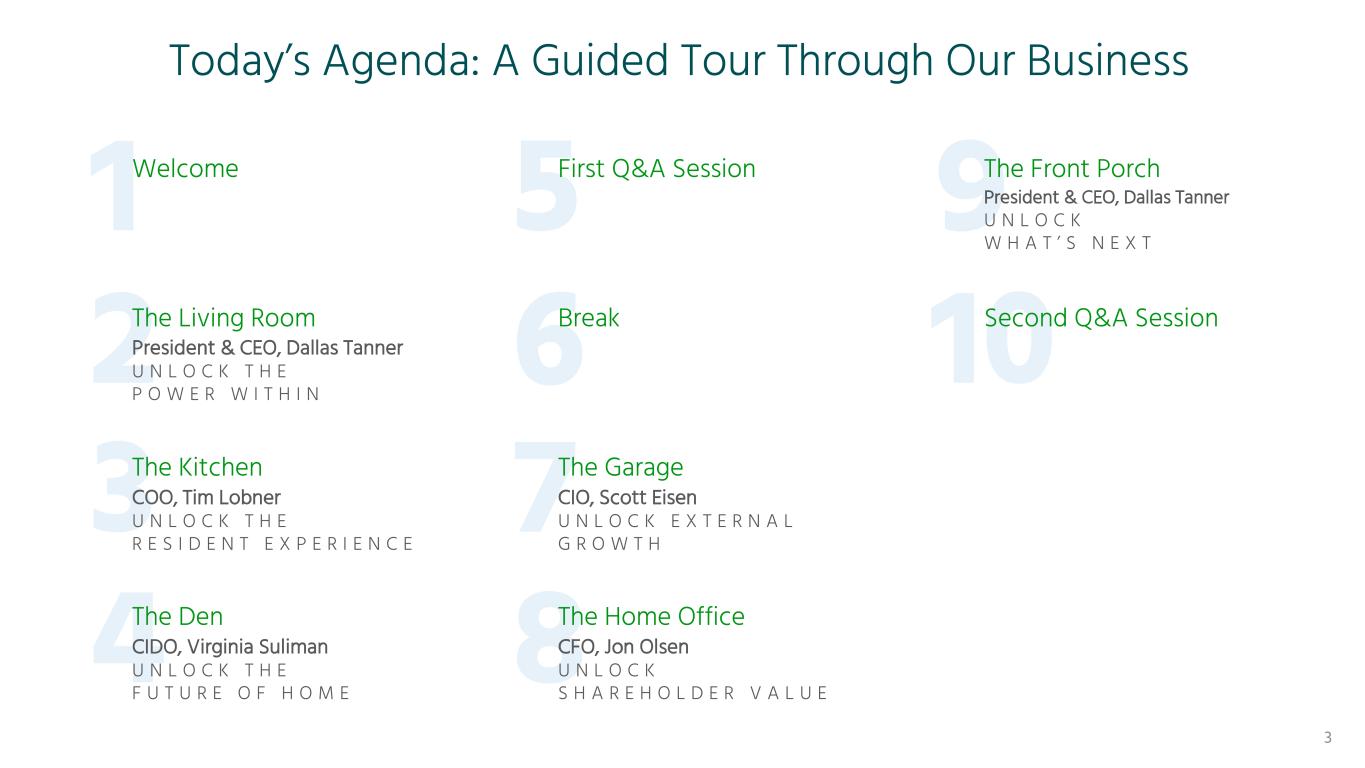 Today’s Agenda: A Guided Tour Through Our Business Welcome First Q&A Session The Front Porch President & CEO, Dallas Tanner U N L O C K W H A T ’ S N E X T The Living Room President & CEO, Dallas Tanner U N L O C K T H E P O W E R W I T H I N Break Second Q&A Session The Kitchen COO, Tim Lobner U N L O C K T H E R E S I D E N T E X P E R I E N C E The Garage CIO, Scott Eisen U N L O C K E X T E R N A L G R O W T H The Den CIDO, Virginia Suliman U N L O C K T H E F U T U R E O F H O M E The Home Office CFO, Jon Olsen U N L O C K S H A R E H O L D E R V A L U E 3