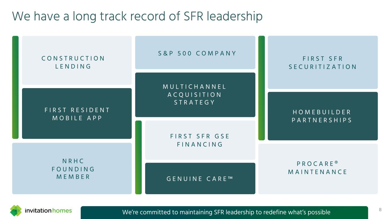Three distinct phases of growth since our founding 7 0 20,000 40,000 60,000 80,000 100,000 120,000 2012 2013 2014 2015 2016 2017 2018 2019 2020 2021 2022 2023 2024 2025 Beyond 1st Asset accumulation 2nd Consolidation 3rd Opening the aperture We’re still in the early days of our third phase of growth Number of Homes Owned / Managed