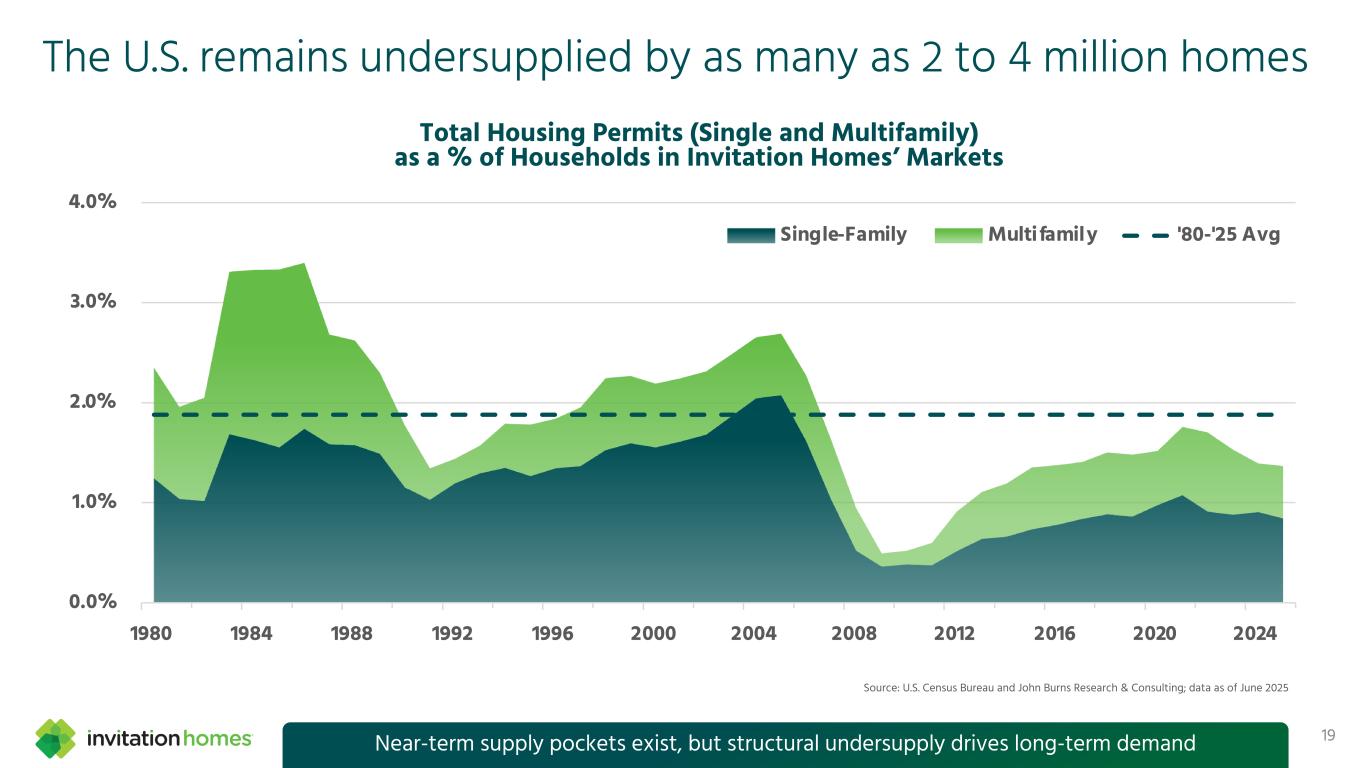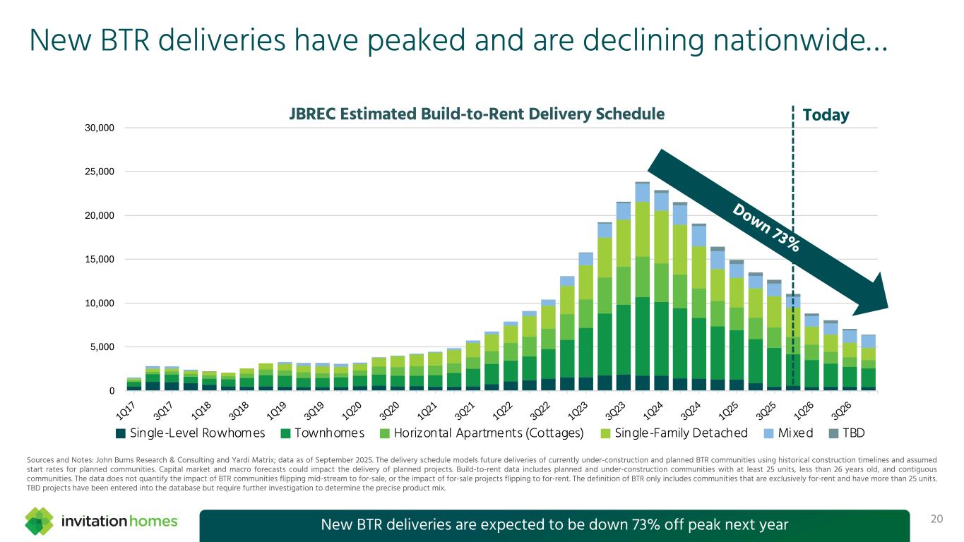 The U.S. remains undersupplied by as many as 2 to 4 million homes Total Housing Permits (Single and Multifamily) as a % of Households in Invitation Homes’ Markets 0.0% 1.0% 2.0% 3.0% 4.0% 1980 1984 1988 1992 1996 2000 2004 2008 2012 2016 2020 2024 Single-Family Multifamily '80-'25 Avg Source: U.S. Census Bureau and John Burns Research & Consulting; data as of June 2025 19Near-term supply pockets exist, but structural undersupply drives long-term demand