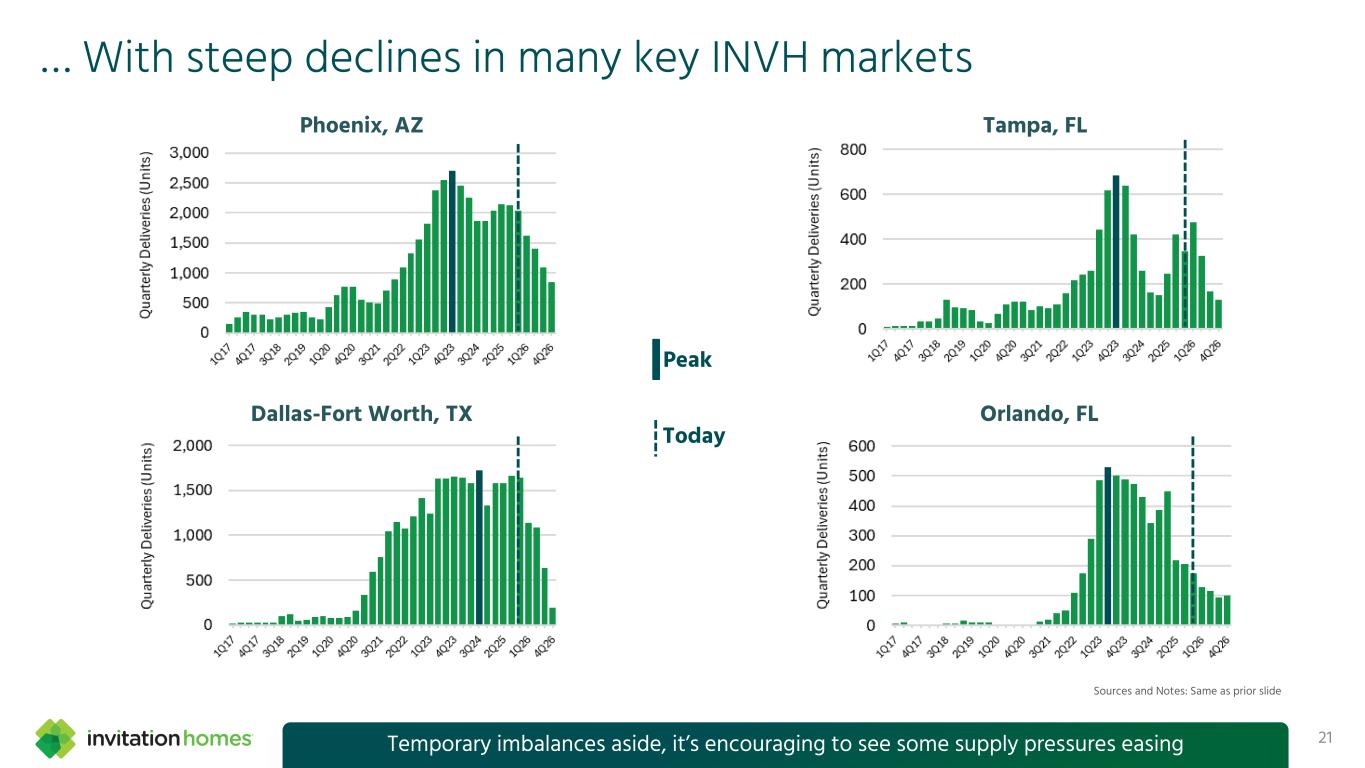 New BTR deliveries have peaked and are declining nationwide… 20 0 5,000 10,000 15,000 20,000 25,000 30,000 1Q 17 3Q 17 1Q 18 3Q 18 1Q 19 3Q 19 1Q 20 3Q 20 1Q 21 3Q 21 1Q 22 3Q 22 1Q 23 3Q 23 1Q 24 3Q 24 1Q 25 3Q 25 1Q 26 3Q 26 JBREC Estimated Build-to-Rent Delivery Schedule Single-Level Rowhomes Townhomes Horizontal Apartments (Cottages) Single-Family Detached Mixed TBD Today Down 73% New BTR deliveries are expected to be down 73% off peak next year Sources and Notes: John Burns Research & Consulting and Yardi Matrix; data as of September 2025. The delivery schedule models future deliveries of currently under-construction and planned BTR communities using historical construction timelines and assumed start rates for planned communities. Capital market and macro forecasts could impact the delivery of planned projects. Build-to-rent data includes planned and under-construction communities with at least 25 units, less than 26 years old, and contiguous communities. The data does not quantify the impact of BTR communities flipping mid-stream to for-sale, or the impact of for-sale projects flipping to for-rent. The definition of BTR only includes communities that are exclusively for-rent and have more than 25 units. TBD projects have been entered into the database but require further investigation to determine the precise product mix.