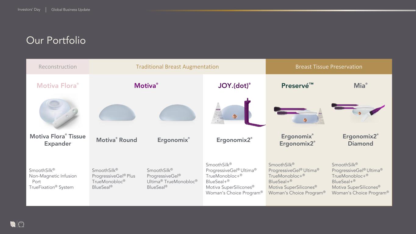 Global Business UpdateInvestors’ Day Reconstruction Traditional Breast Augmentation Breast Tissue Preservation Motiva Flora® Motiva® JOY.(dot)® Preservé Mia® Motiva Flora® Tissue Expander Motiva® Round Ergonomix® Ergonomix2® Ergonomix® Ergonomix2® Ergonomix2® Diamond SmoothSilk® Non-Magnetic Infusion Port TrueFixation® System SmoothSilk® ProgressiveGel® Plus TrueMonobloc® BlueSeal® SmoothSilk® ProgressiveGel® Ultima® TrueMonobloc® BlueSeal® SmoothSilk® ProgressiveGel® Ultima® TrueMonobloc+® BlueSeal+® Motiva SuperSilicones® Woman’s Choice Program® SmoothSilk® ProgressiveGel® Ultima® TrueMonobloc+® BlueSeal+® Motiva SuperSilicones® Woman’s Choice Program® SmoothSilk® ProgressiveGel® Ultima® TrueMonobloc+® BlueSeal+® Motiva SuperSilicones® Woman’s Choice Program® Our Portfolio