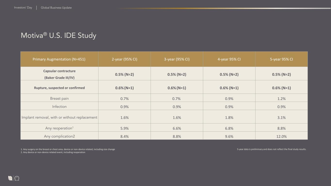 Primary Augmentation (N=451) 2-year (95% CI) 3-year (95% CI) 4-year 95% CI 5-year 95% CI Capsular contracture (Baker Grade III/IV) 0.5% (N=2) 0.5% (N=2) 0.5% (N=2) 0.5% (N=2) Rupture, suspected or confirmed 0.6% (N=1) 0.6% (N=1) 0.6% (N=1) 0.6% (N=1) Breast pain 0.7% 0.7% 0.9% 1.2% Infection 0.9% 0.9% 0.9% 0.9% Implant removal, with or without replacement 1.6% 1.6% 1.8% 3.1% Any reoperation1 5.9% 6.6% 6.8% 8.8% Any complication2 8.4% 8.8% 9.6% 12.0% 5-year data is preliminary and does not reflect the final study results. Motiva® U.S. IDE Study 1. Any surgery on the breast or chest area, device or non-device related, including size change 2. Any device or non-device related event, including reoperation Global Business UpdateInvestors’ Day