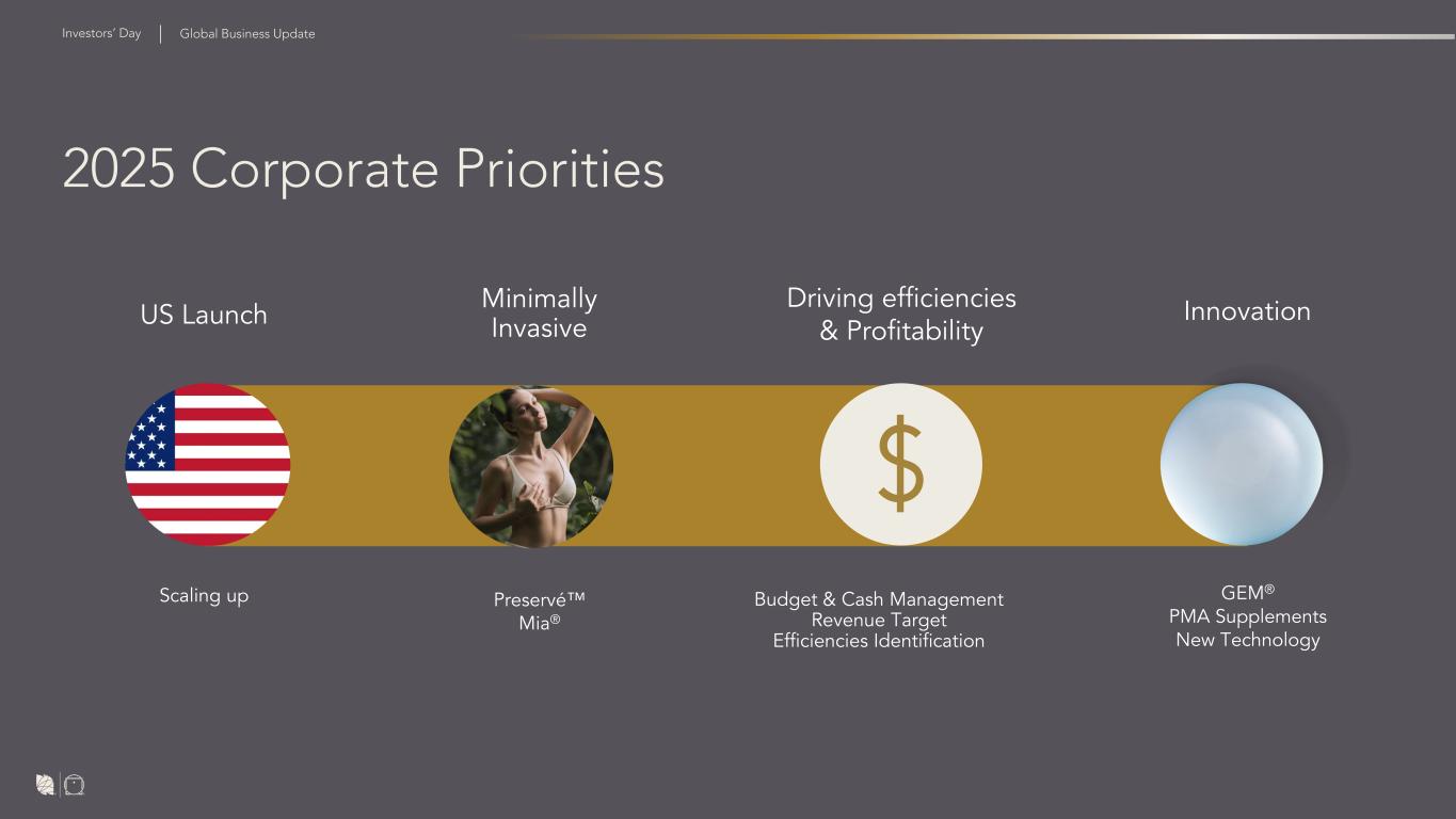 2025 Corporate Priorities Budget & Cash Management Revenue Target Efficiencies Identification Preservé Mia® Scaling up GEM® PMA Supplements New Technology Global Business UpdateInvestors’ Day US Launch InnovationDriving efficiencies & Profitability Minimally Invasive